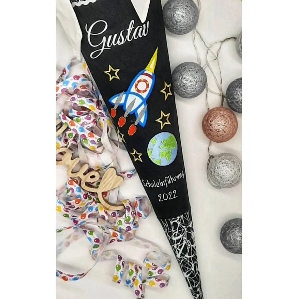 Die Schultüte wird mit dem Namen des Kindes und z.B. Schulkind 202* bestickt.