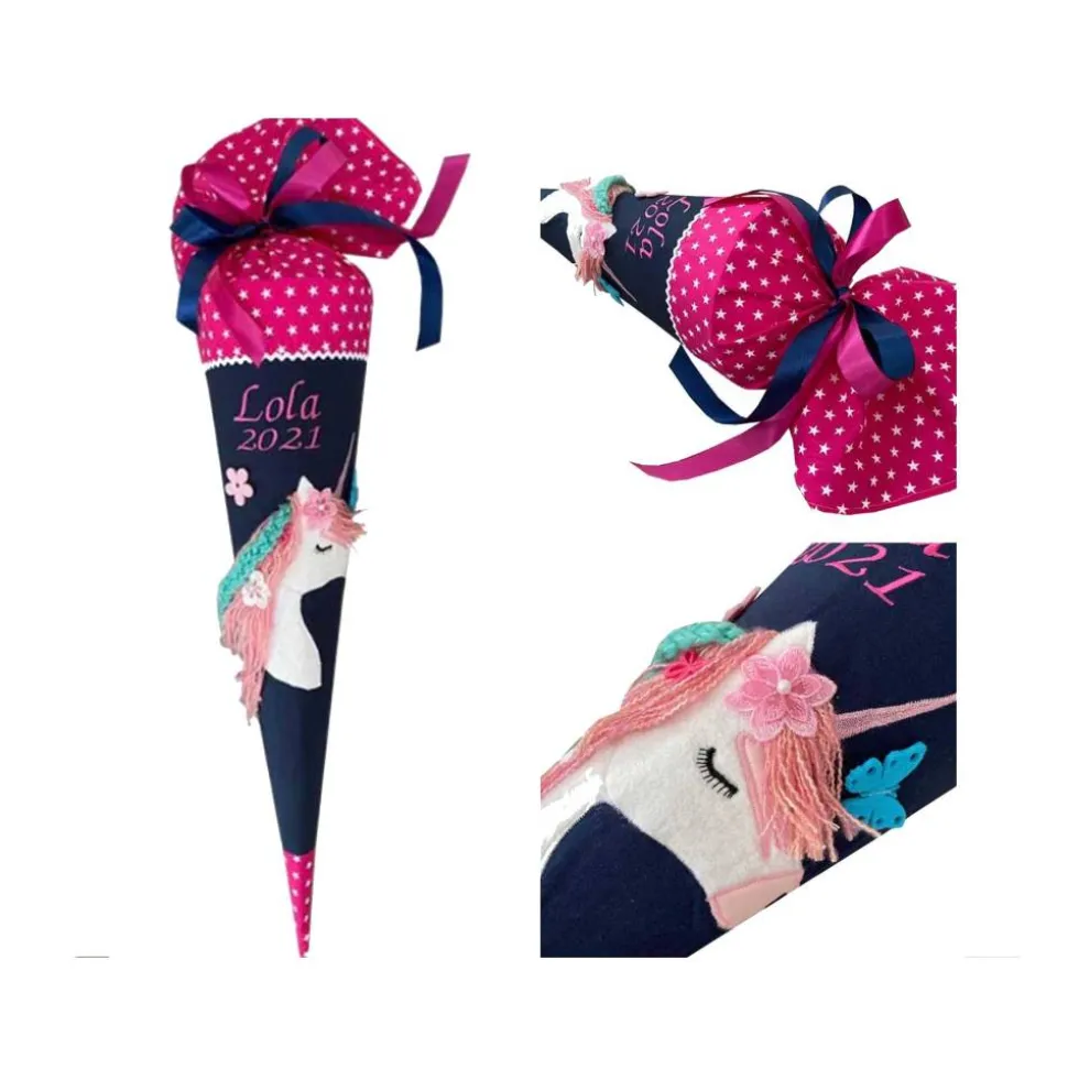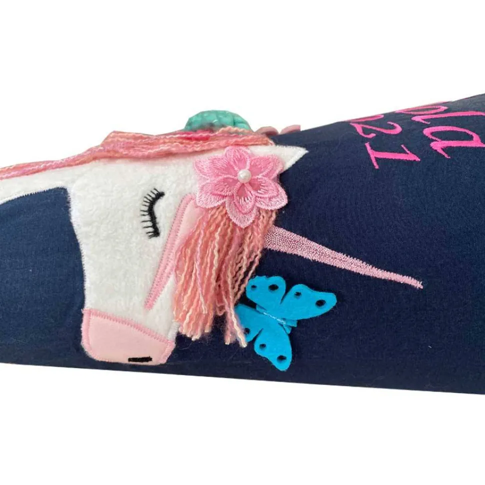 Mit unserer Schultüte Regenbogen Einhorn geht der Traum vieler Mädchen nach Glitzer und Glimmer in Erfüllung. Das bezaubernde Einhorn ist bei dieser Schultüte sehr aufwendig aufappliziert und verziert. Es hat eine Mähne in Regenbogenfarben, die mit Schmetterlingen und Blumen verziert ist. Zusätzlich ist eine dicke Strähne eingeflochten. Das Horn des Einhorns ist aus rosa Glitzerstoff aufappliziert. Natürlich wird Ihre persönliche Schultüte auch von uns individuell mit Namen und Einschulungsdatum bestickt.