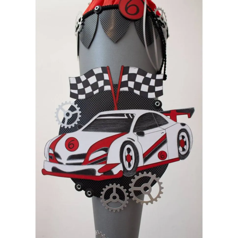 Das “Rennauto“ ist ein absoluter Hingucker. Es ist in liebevoller Detailarbeit aus Fotokarton in weiß, rot und schwarz, plastisch gefertigt. Das „Rennauto“ ist auf einem verstärkten Kreis aus Fotokarton befestigt, die Folie in Carbon Optik spiegelt sich hier wieder. Auch hier finden sich Zahnräder, Schraubmuttern und Rennflaggen wieder und runden das harmonische Gesamtbild der Schultüte ab.