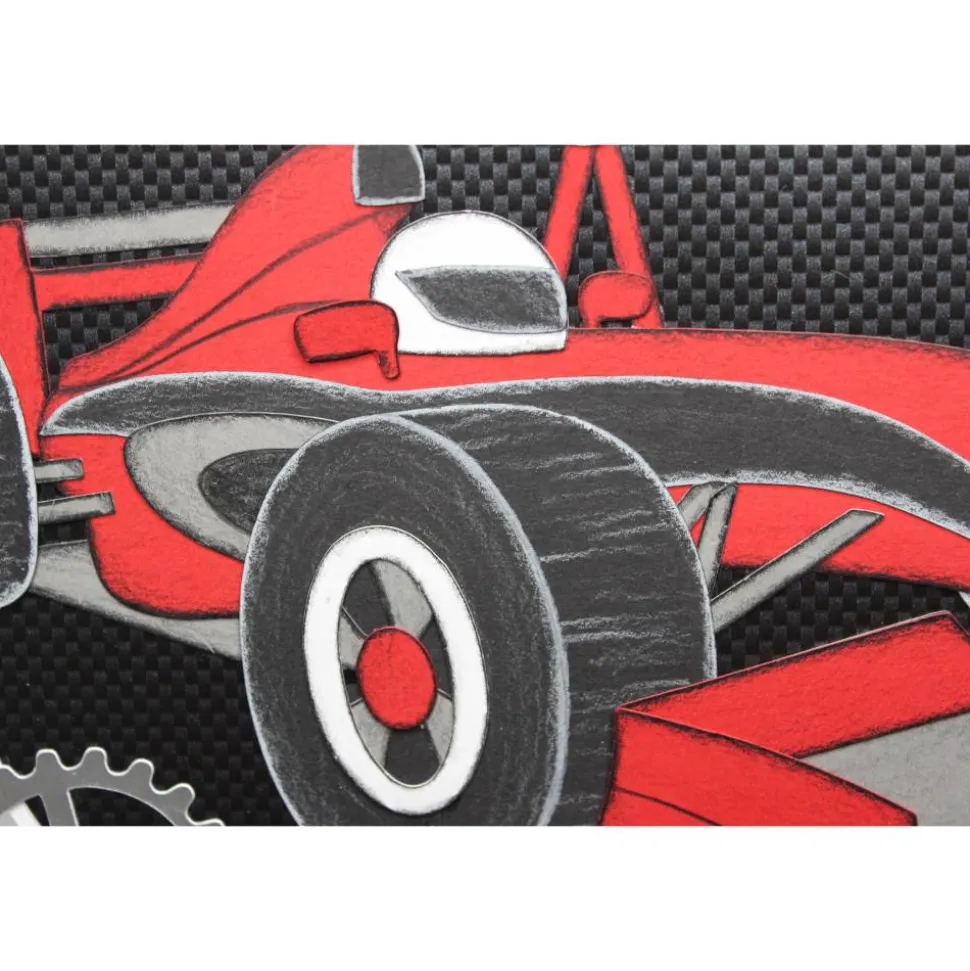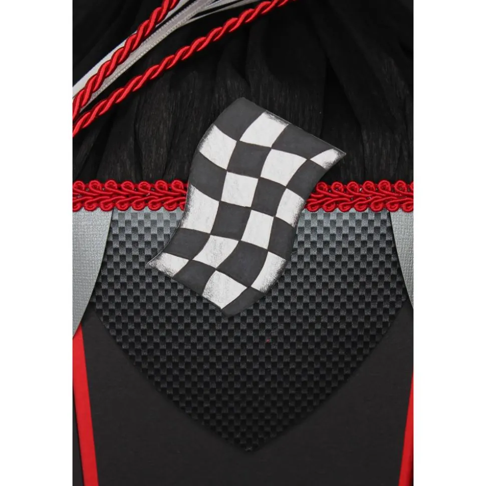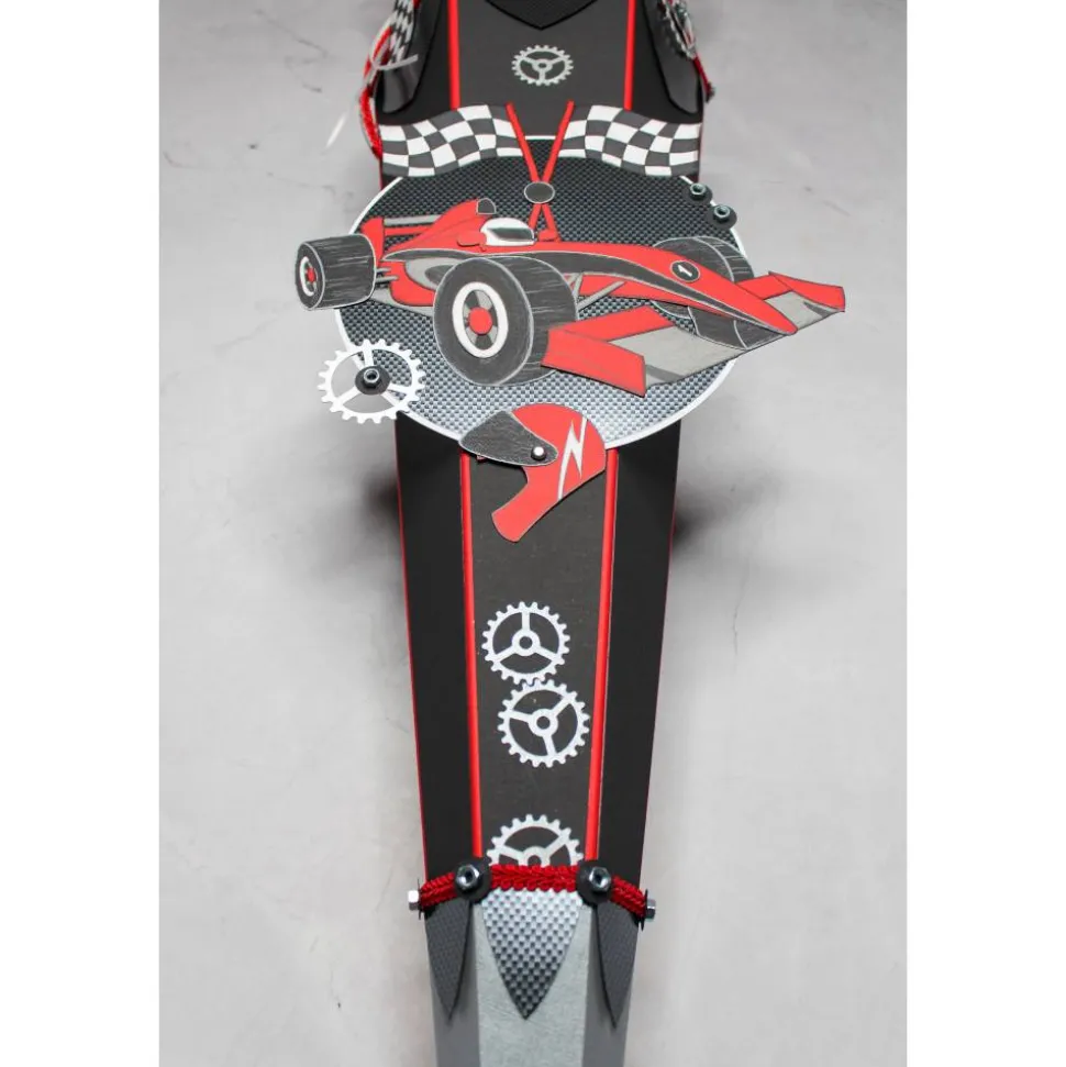 Der Rennwagen ist auf einem verstärkten Kreis aus Fotokarton befestigt und bietet so mehr Stabilität auf der Schultüte, die Folie in Carbon Optik spiegelt sich hier wider, ebenso einzelne Elemente.