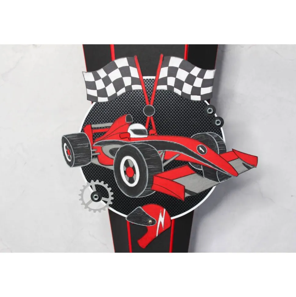 Für einen sauberen Übergang sorgt eine rote Bordüre, eine rote Holzspitze bildet den Abschluss. Der Manschettenrand ist mit silbernen Zahnrädern aus Fotokarton, Rennflaggen, Sturzhelmen und kleinen Schraubmuttern verziert, die Schraubmuttern finden sich auch an der Spitze wieder.