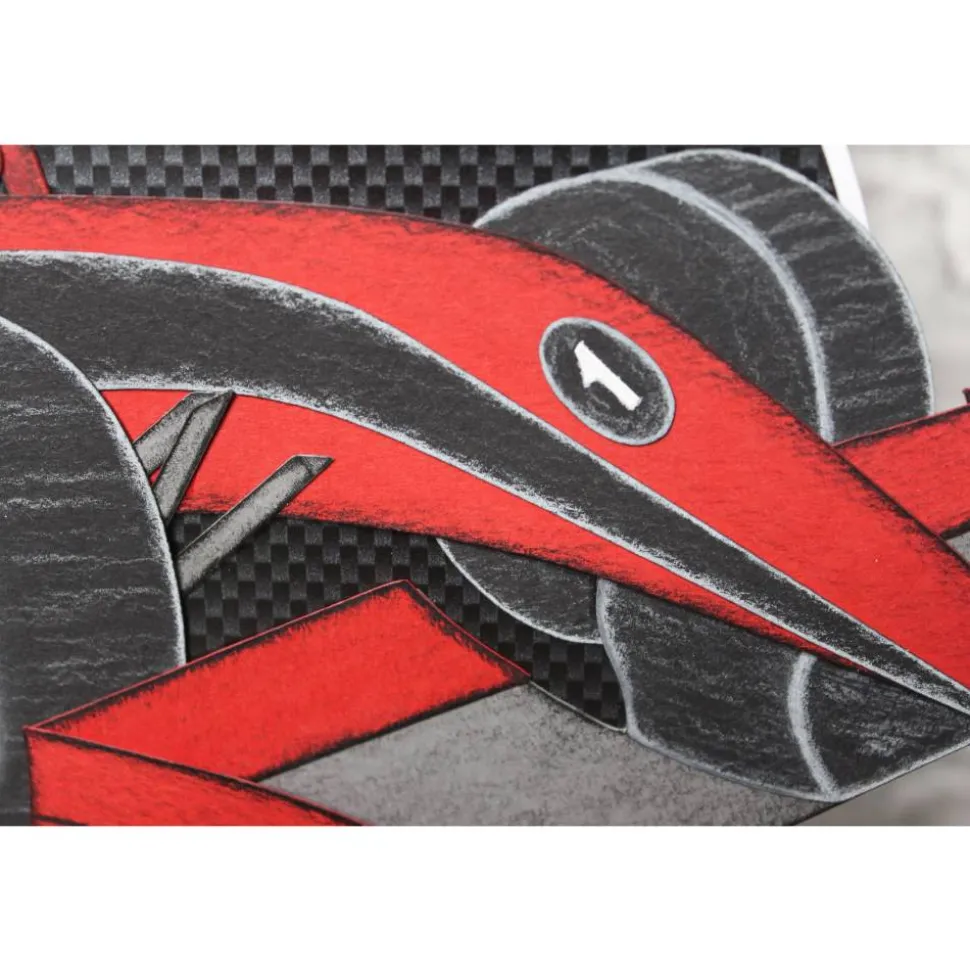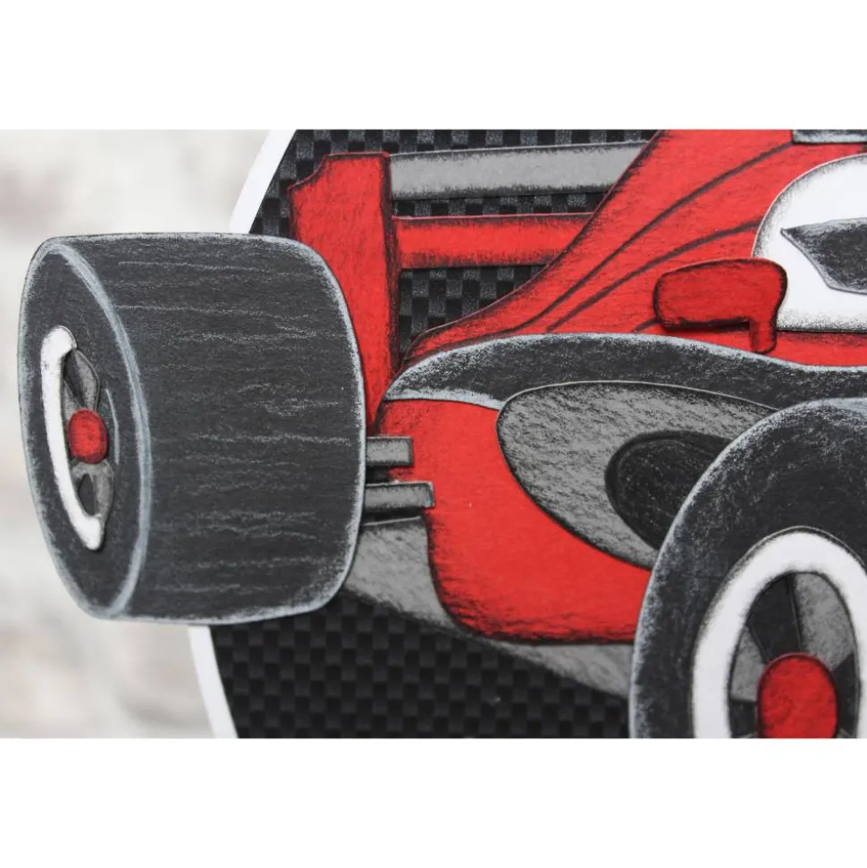 Der Rennwagen ist auf einem verstärkten Kreis aus Fotokarton befestigt und bietet so mehr Stabilität auf der Schultüte, die Folie in Carbon Optik spiegelt sich hier wider, ebenso einzelne Elemente.
