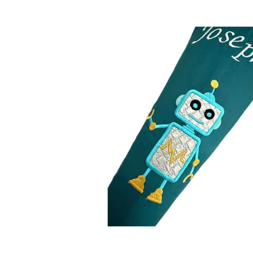 Den Roboter auf unserer Schultüte Roboter haben wir aus Metallicstoffen appliziert, so dass er richtig roboterhaft aussieht. Wir haben diese Schultüte passend zum Ergobag Schulranzen „RobotBär“ entworfen. Der kleine Roboter winkt dem Schulkind freundlich zu. Natürlich wird Deine persönliche Schultüte auch von uns individuell mit Namen und Einschulungsdatum bestickt.