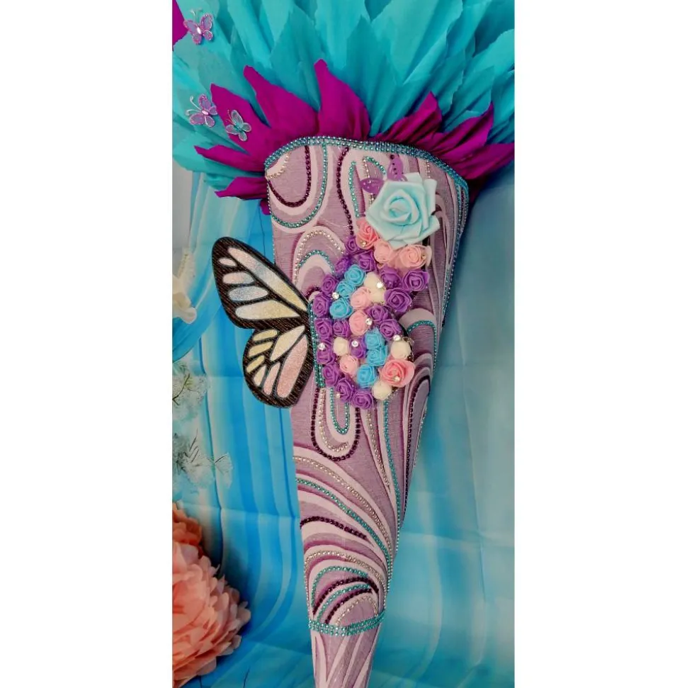 Diese liebevoll handgefertigte Schultüte ist ein echter Hingucker zum Schulanfang! Das elegante Design in Lila, Blau und Pink wird durch detailreiche Verzierungen wie glitzernde Schmetterlinge, filigrane Blüten und funkelnde Perlen abgerundet. Die große Schmetterlingsapplikation und die Blumen machen diese Schultüte zu einem ganz besonderen Geschenk für den ersten Schultag.