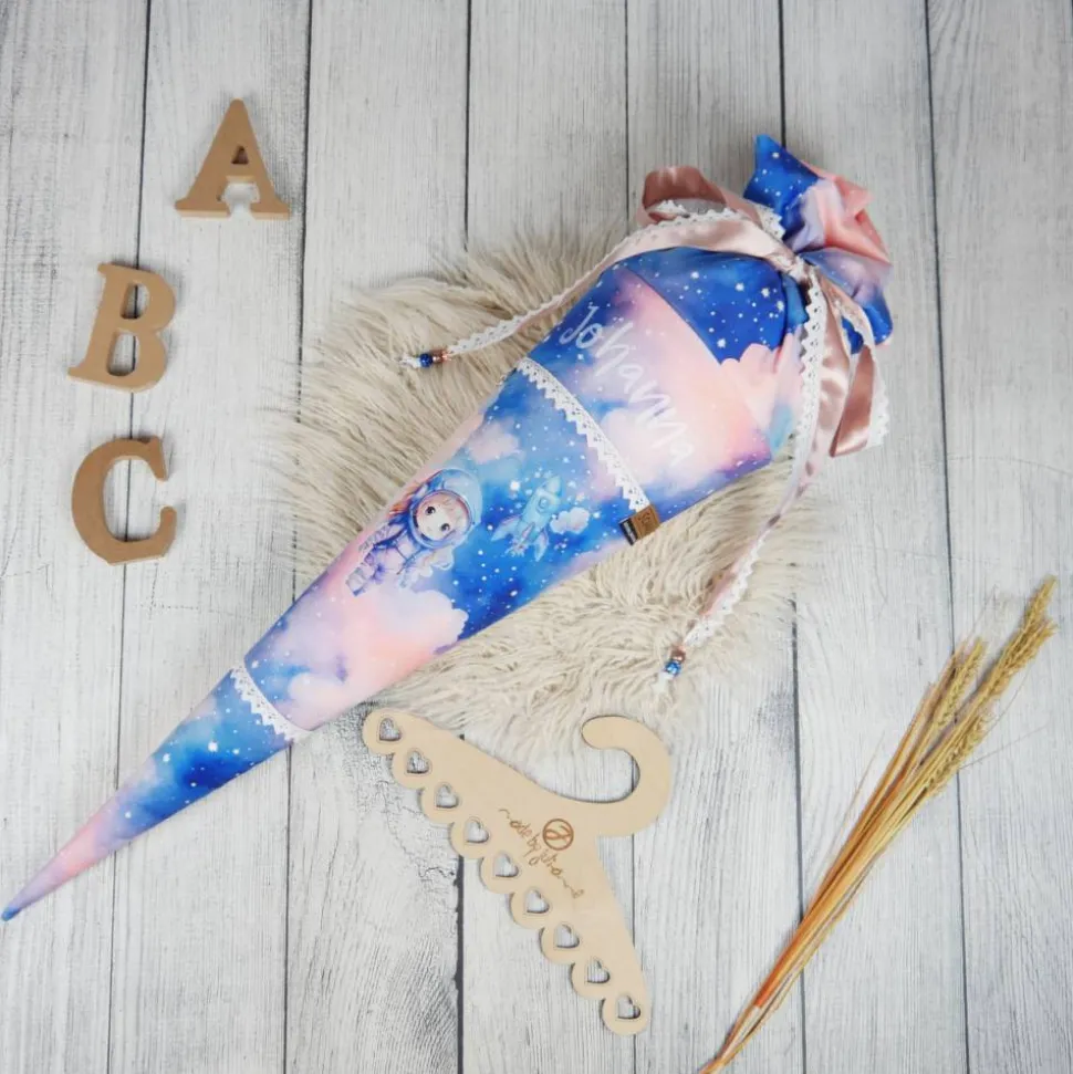 Schultüte aus Baumwolle mit verschiedenen dekorativen Details.