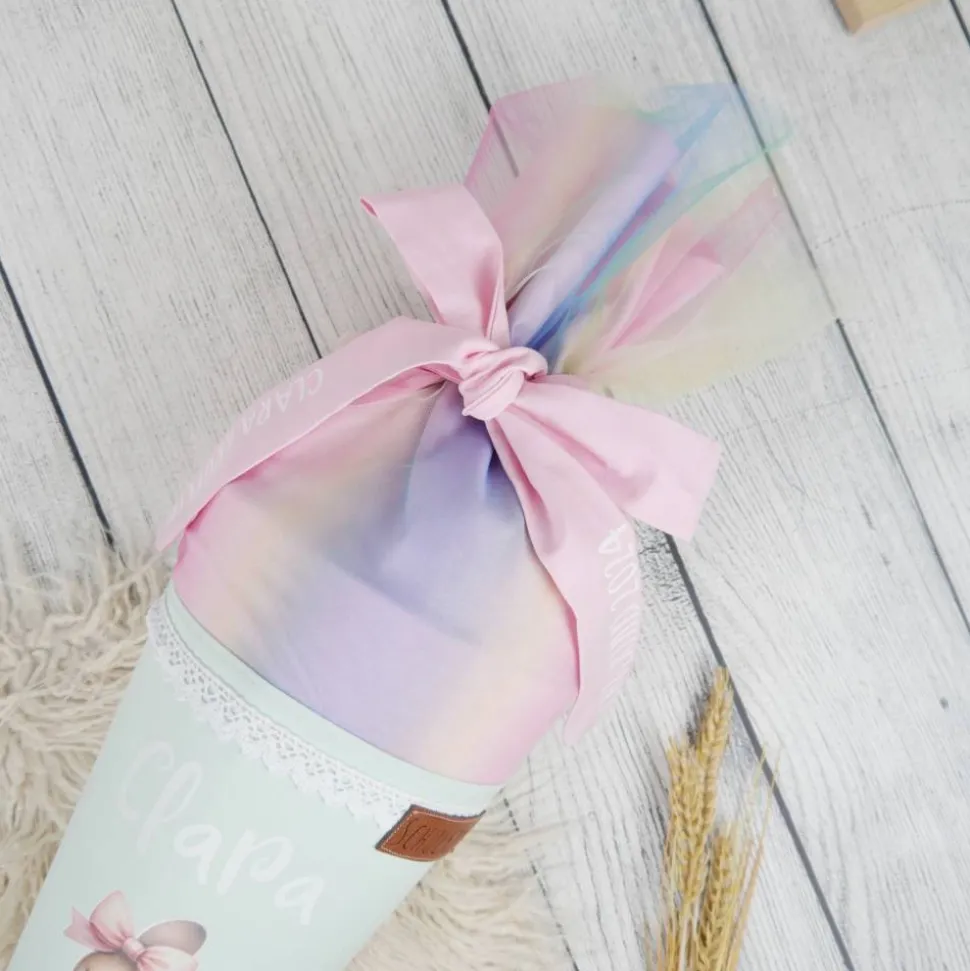 Schultüte aus Baumwolle mit verschiedenen dekorativen Details und Tüll.