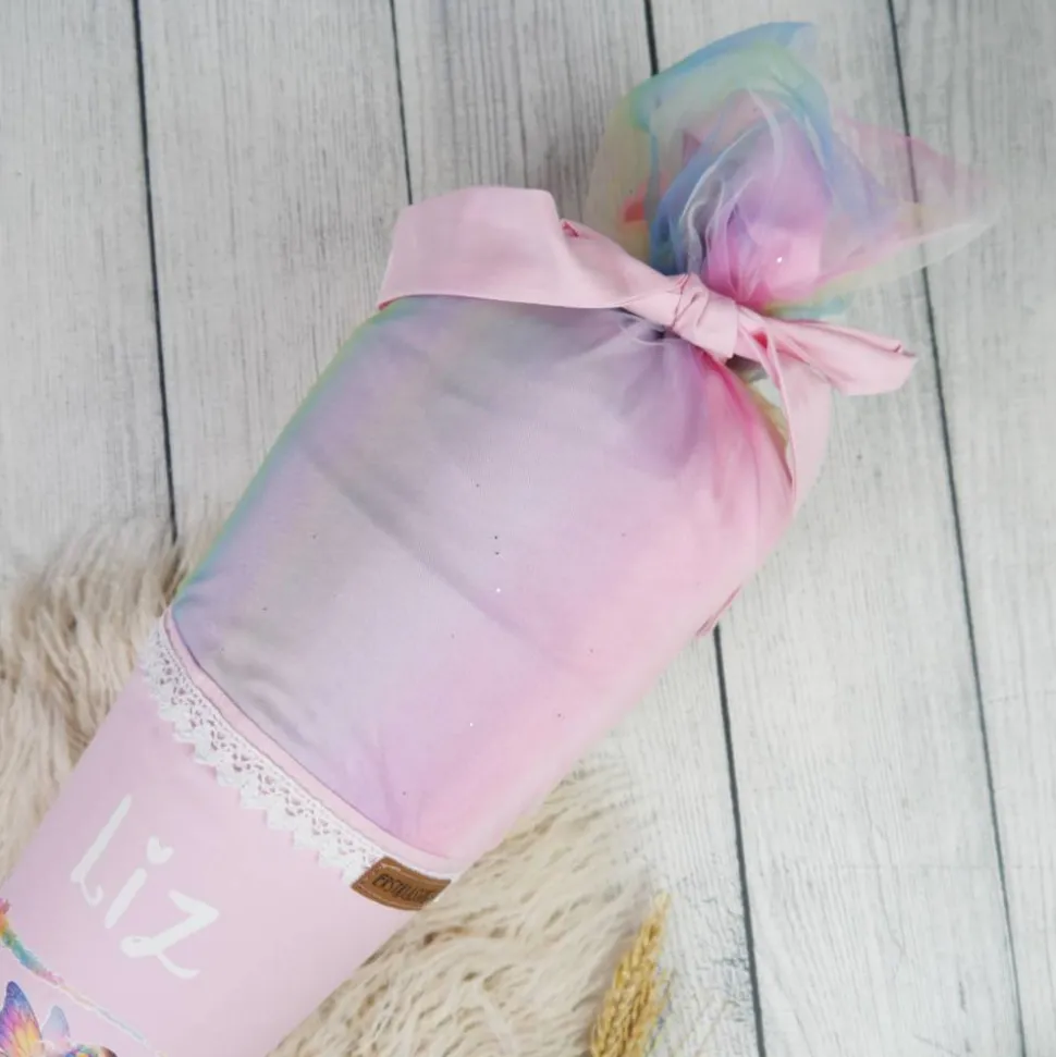 Schultüte aus Baumwolle mit verschiedenen dekorativen Details.