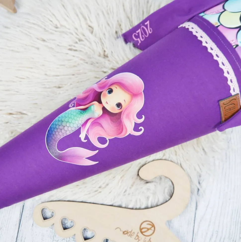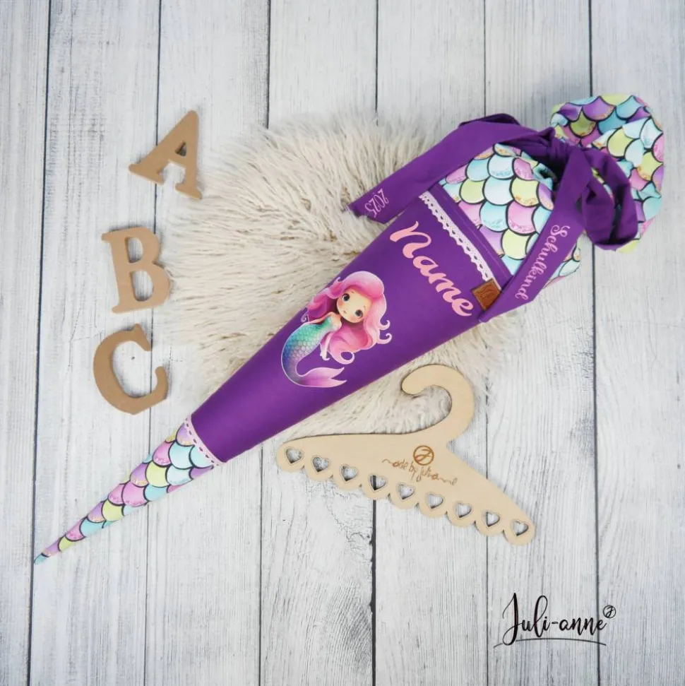 Schultüte aus Baumwolle mit verschiedenen dekorativen Details.