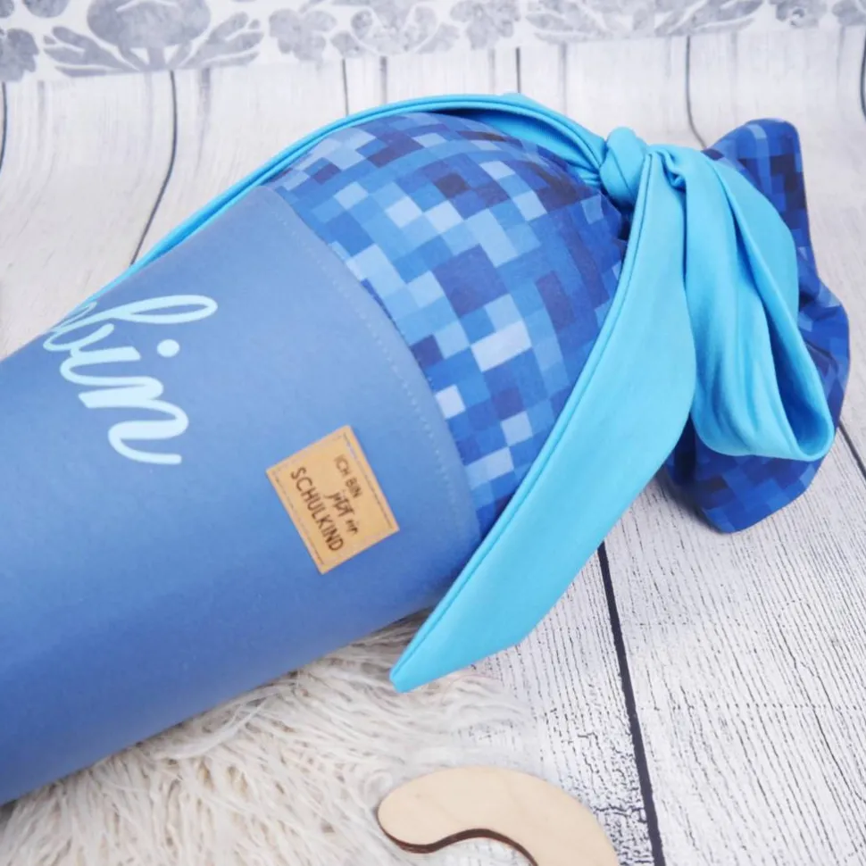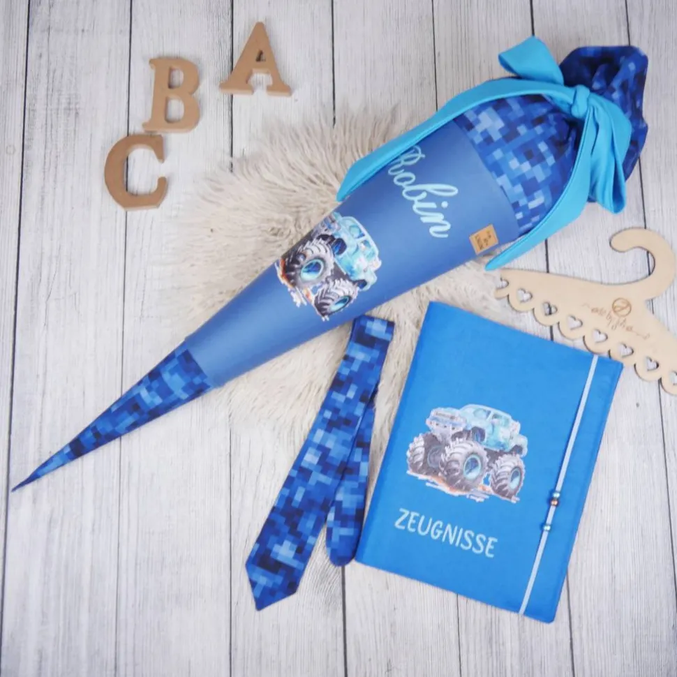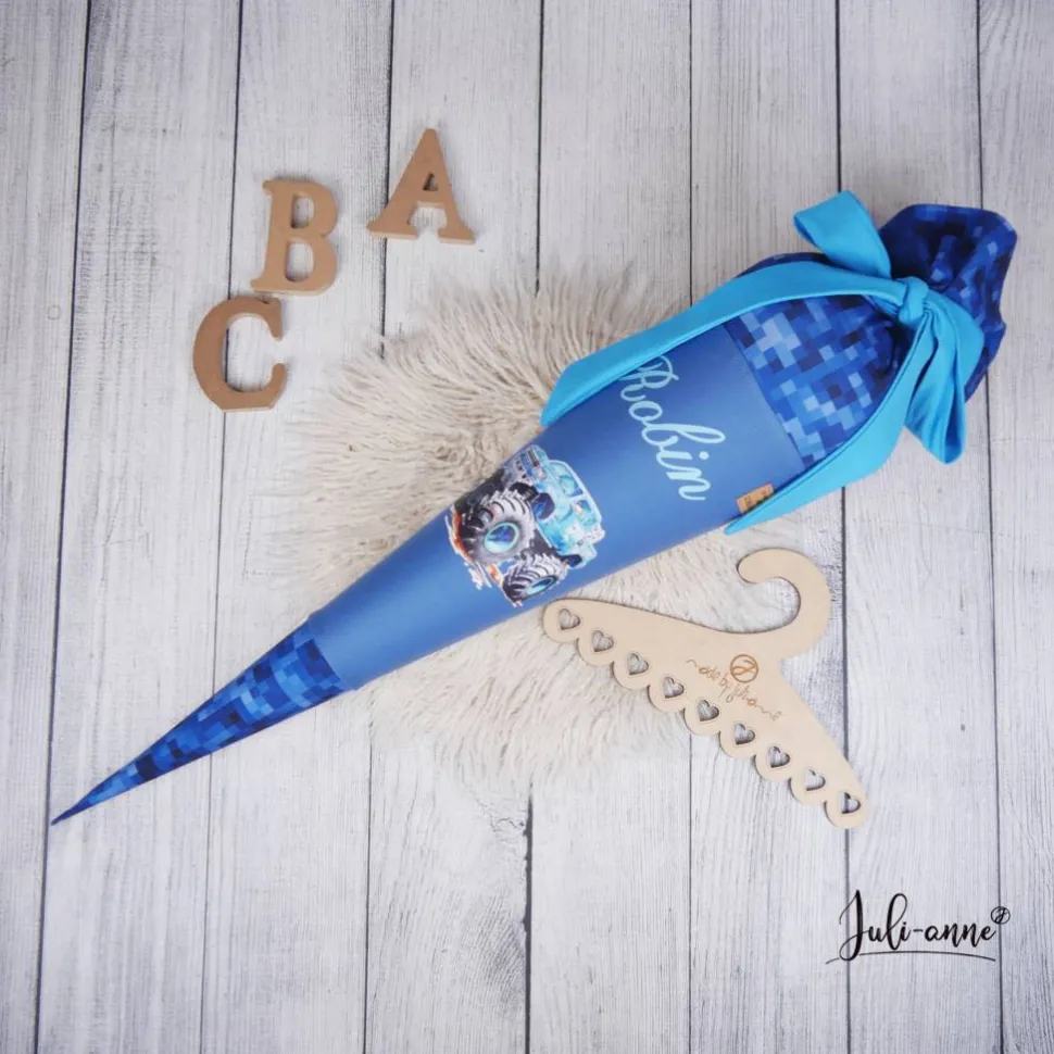 Schultüte Stoff Monstertruck Türkis Pixel 70cm 85cm   *personalisierbar und mit Kisseninlet