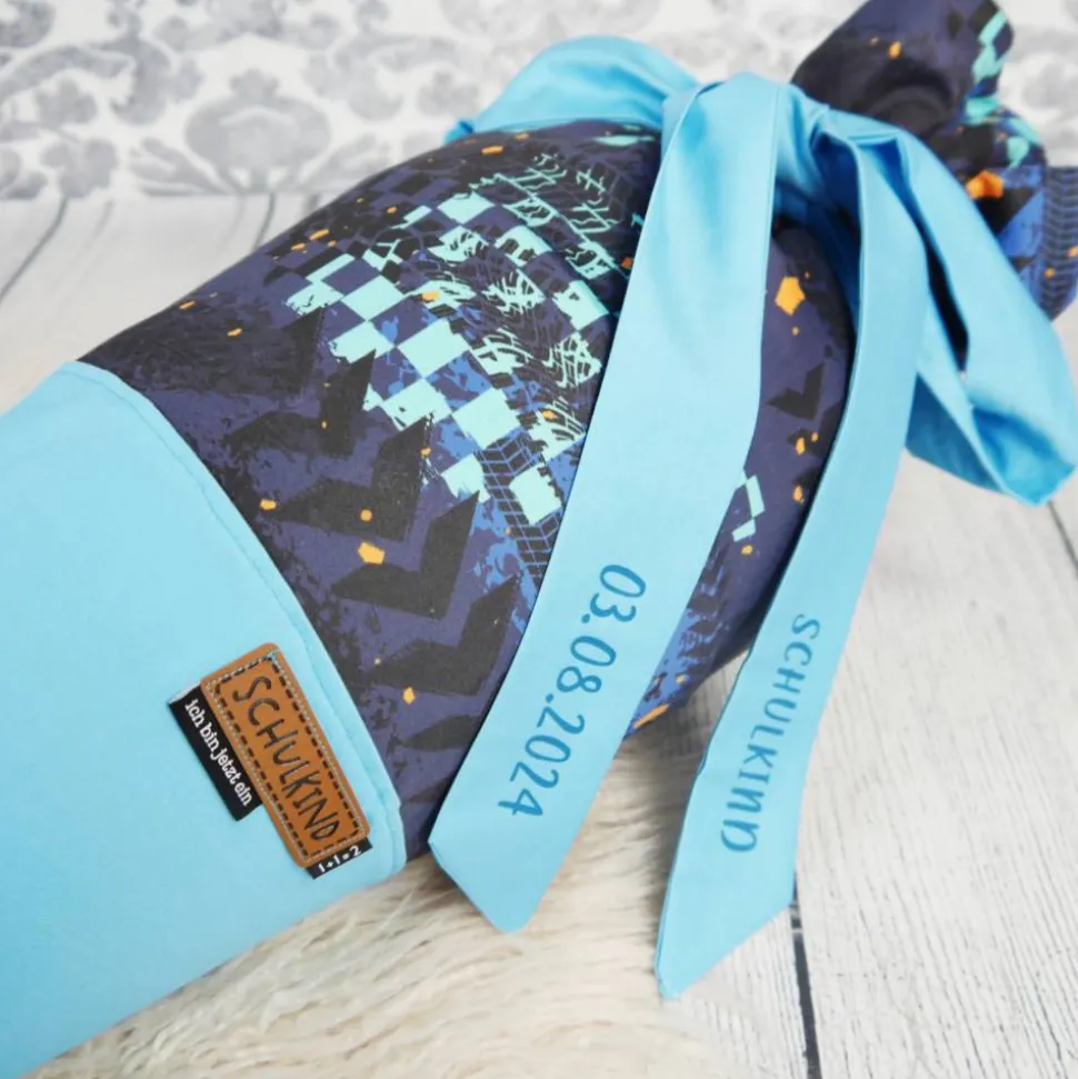 Schultüte Stoff Motocross Türkis Blau  70cm 85cm   *personalisierbar und mit Kisseninlet