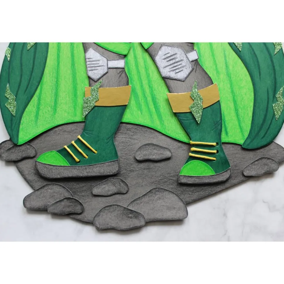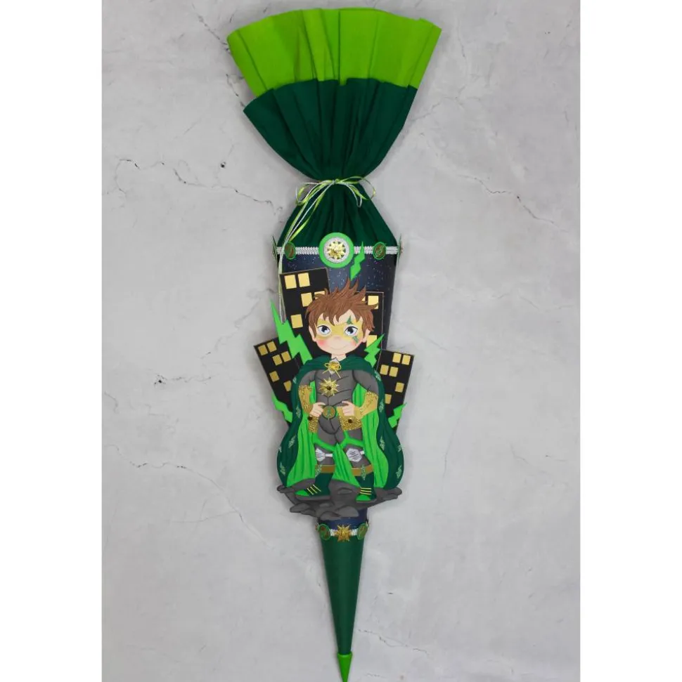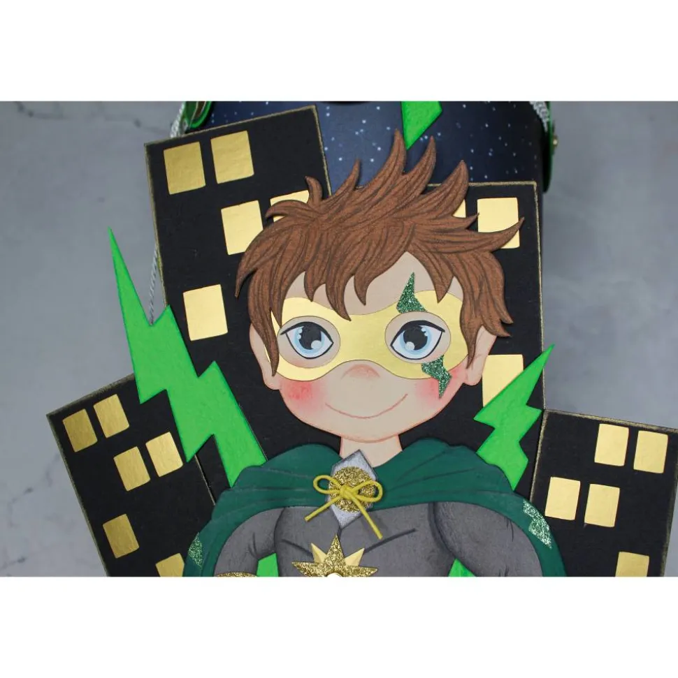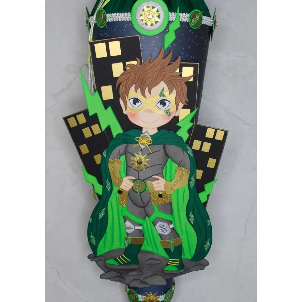 Der zuckersüße Superheld „Luca“, bildet vor der beleuchteten Stadtsilhouette, das Hauptmotiv und ist der absolute Hingucker! „Luca“ ist sehr detailliert aus verschiedenen Fotokartonfarben gefertigt, einzelne Elemente aus Glitterkarton sorgen für zusätzliche Highlights, ebenso wie die goldene Maske, Schnürsenkel und glitzernde Blitze auf dem Umhang. Die Figur ist teilweise, die Stadtsilhouette doppelt aus Fotokarton gefertigt und sorgt so für mehr Stabilität auf der Schultüte.