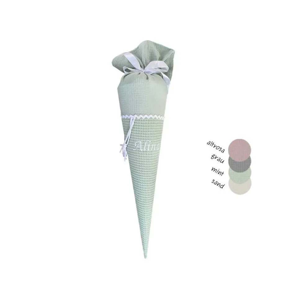 Unsere Schultüte Waffelpique mit Namen überzeugt durch ihr schlichtes und zeitloses Design. Wir bieten diese Stoff Schultüte in vier zarten Pastellfarben – passend für Jungen und Mädchen – an. Die Tülle unserer Schultüte Waffelpique mit Namen ist aus zartem Musselin gearbeitet, der sich im Hauptteil beim Waffelpique widerholt. Der Blickfang sind schlichte Details, wie die breite Zackenborte und die Quaste in weiß passend zum eingestickten Namen. Natürlich wird Ihre persönliche Schultüte auch von uns individuell mit Namen und Einschulungsjahr bestickt. Damit wird der Schulanfang zu einem perfekten Ereignis!