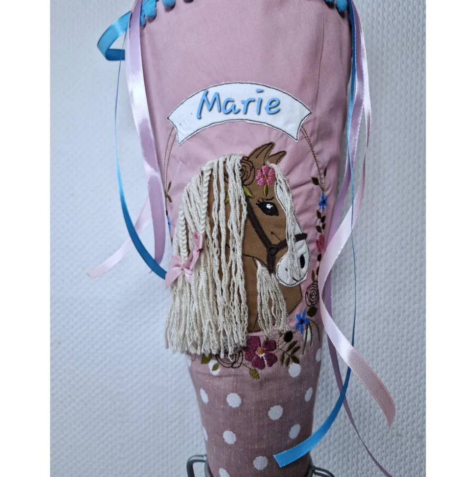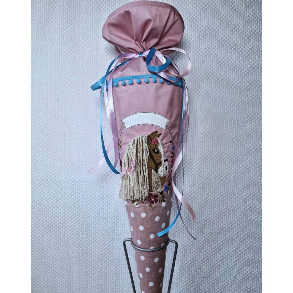 Ich kann gerne kurzfristig die Schultüte personalisieren. Der Vorname könnte in altrosa oder wie hier in der Fotomontage in türkis über das Pony auf das Namensschild aufgestickt werden.