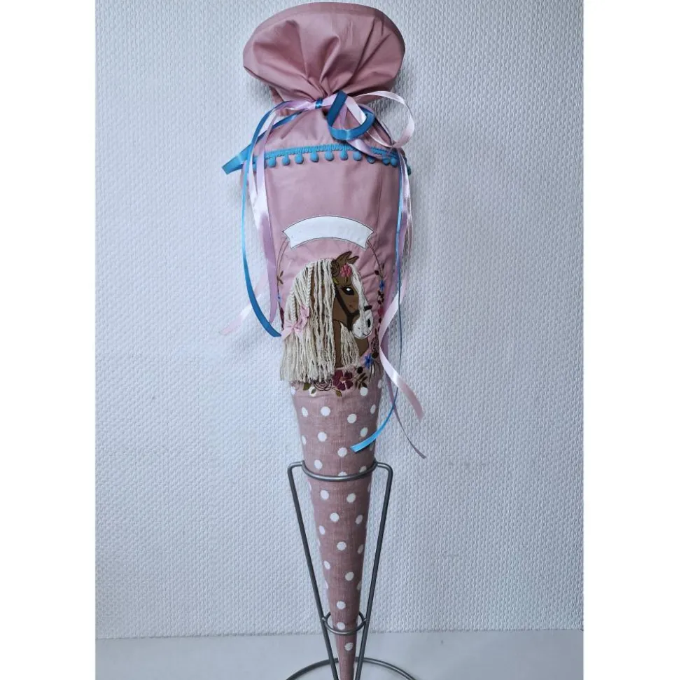 Dies ist eine Schultüte mit einem Boho Pony. Der untere Teil der Tüte besteht aus einem Stoff mit Punkten.