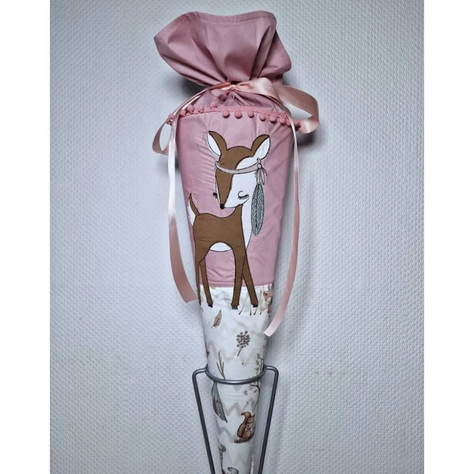 Dies ist eine Schultüte mit einem Boho Reh. Der untere Teil der Tüte besteht aus einem Stoff mit Waldtieren.