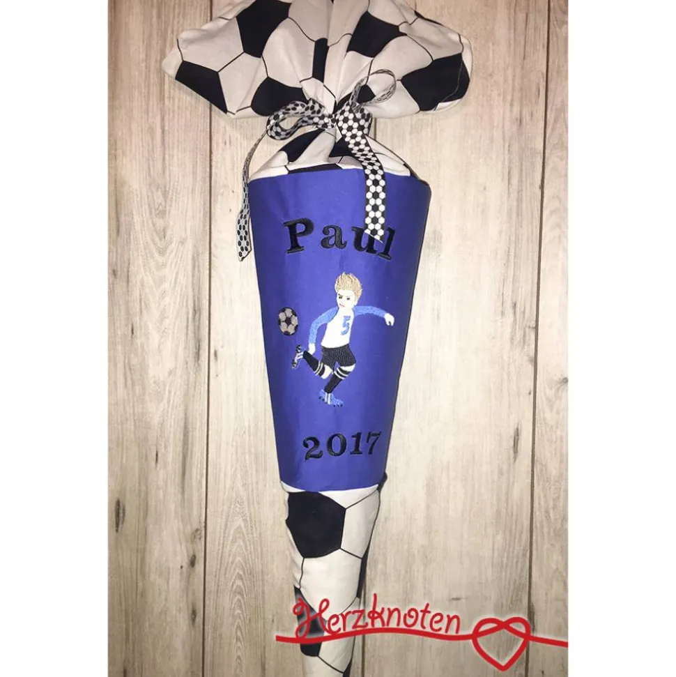 Aus Baumwollstoff mit großem Fußballrauten als Muster, in der Mitte ein schlichter Baumwollstoff in der Farbe Deines Lieblingsvereines. Das Spielertrikot wird natürlich farblich passend gemacht. Über dem Spieler wird der Name eingestickt und unten drunter, falls gewünscht, das Jahr oder Einschulungsdatum. Zugebunden wird die Tüte mit einem Fußballband.
