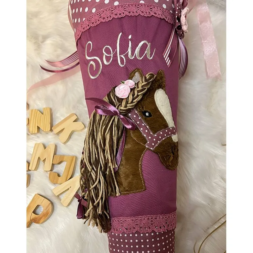 ist eine zuckersüße Schultüte für alle Pferdemädchen, Name und evtl. Einschulungsdatum sind im Preis breits mit inbegriffen, mit pink-weiß gemustertem Baumwollstoff, mit weißen Punkten, groß und klein, in der Mitte ist der Stoff schlicht pink, mit einem super süßem Pferdekopf aus mittelbraunem Kunstfell, mit Mähne aus Wollfäden in den Farben von beige bis braun gemischt, und beiger Blesse,( Kann auch in anderen Fellfarben / Mähne gefertigt werden) die Mähne ist mehrmals geflochen und hat ein farblich passendes Band eingebunden, in der Mähne sind noch zwei pinke Seidenblüten angebracht, nach einem Design von „Klitzkleindesign“, mit farblich passenden Spitzenbändern abgesetzt, mit einer applizierten Trense aus pinkem Stoff mit weißen Pünktchen, am Rand des mittleren Stoffteil ist eine farblich passenden Schleife mit einer Häkelblume und mit Bändern aufgenäht, mit drei verschiedenen Bändern verschlossen, liebvoll und sehr aufwendig gestickt und genäht.
