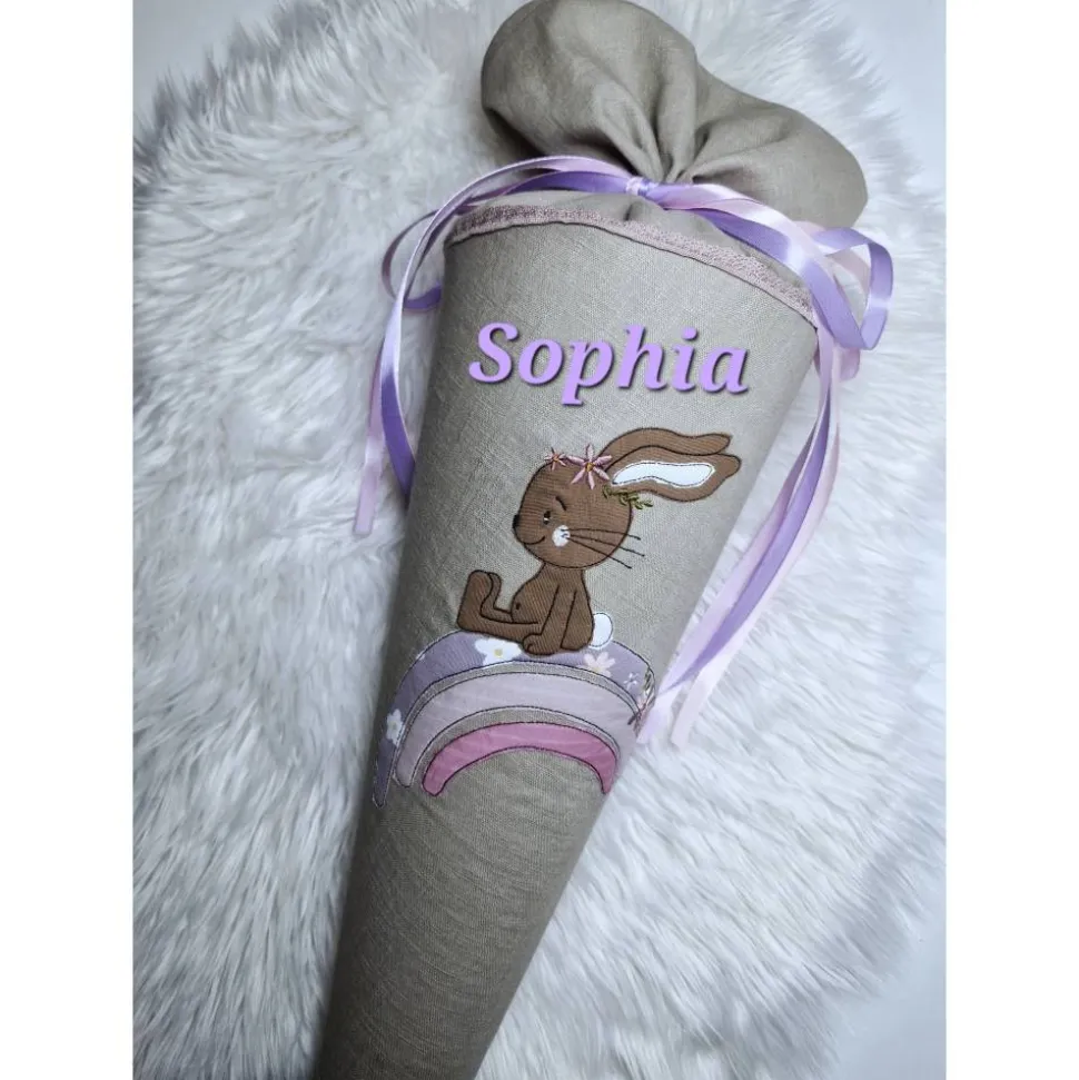 Ich kann gerne kurzfristig die Schultüte personalisieren. Der Vorname könnte zum Beispiel in flieder über die Stickerei aufgestickt werden (so wie auf der Fotomontage).