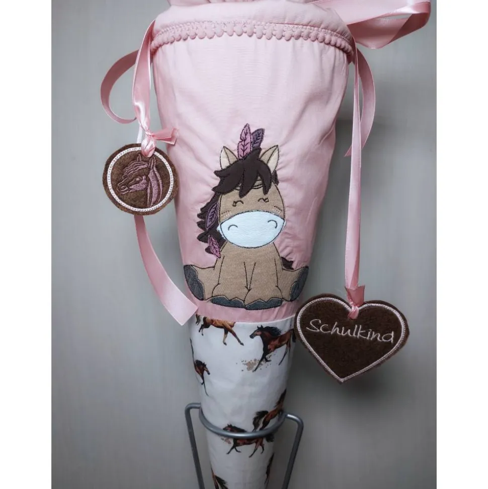 Dies ist eine Schultüte für Mädchen mit einem gestickten Boho Pferd.