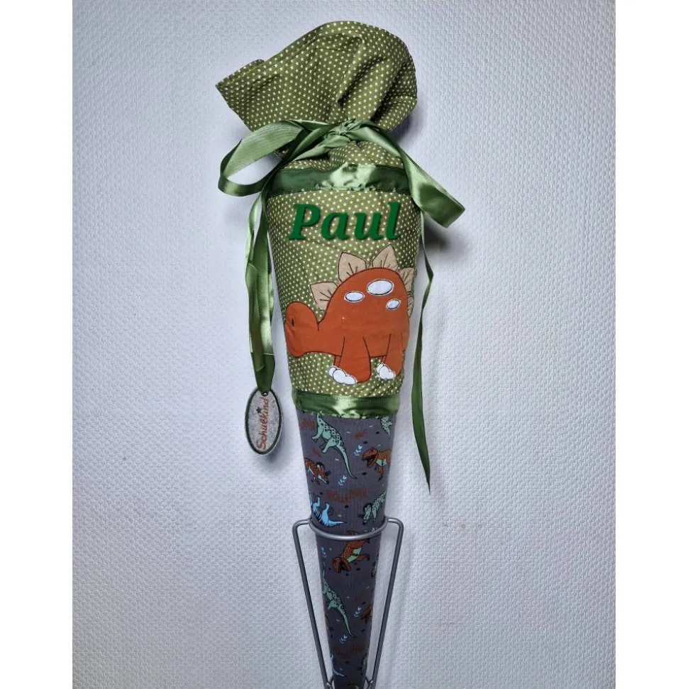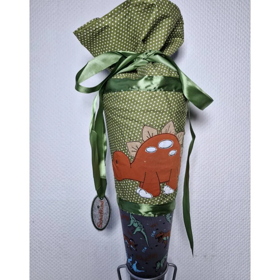 Dies ist eine Schultüte für alle Dinofans mit einem gestickten Dinosaurier. Der untere Teil der Tüte besteht aus einem Dinostoff.