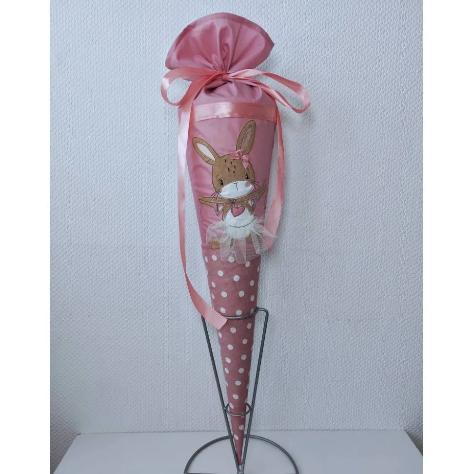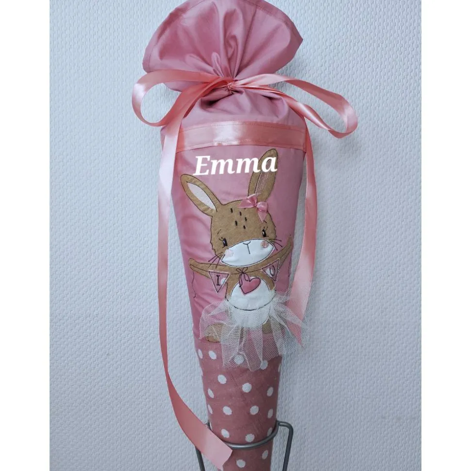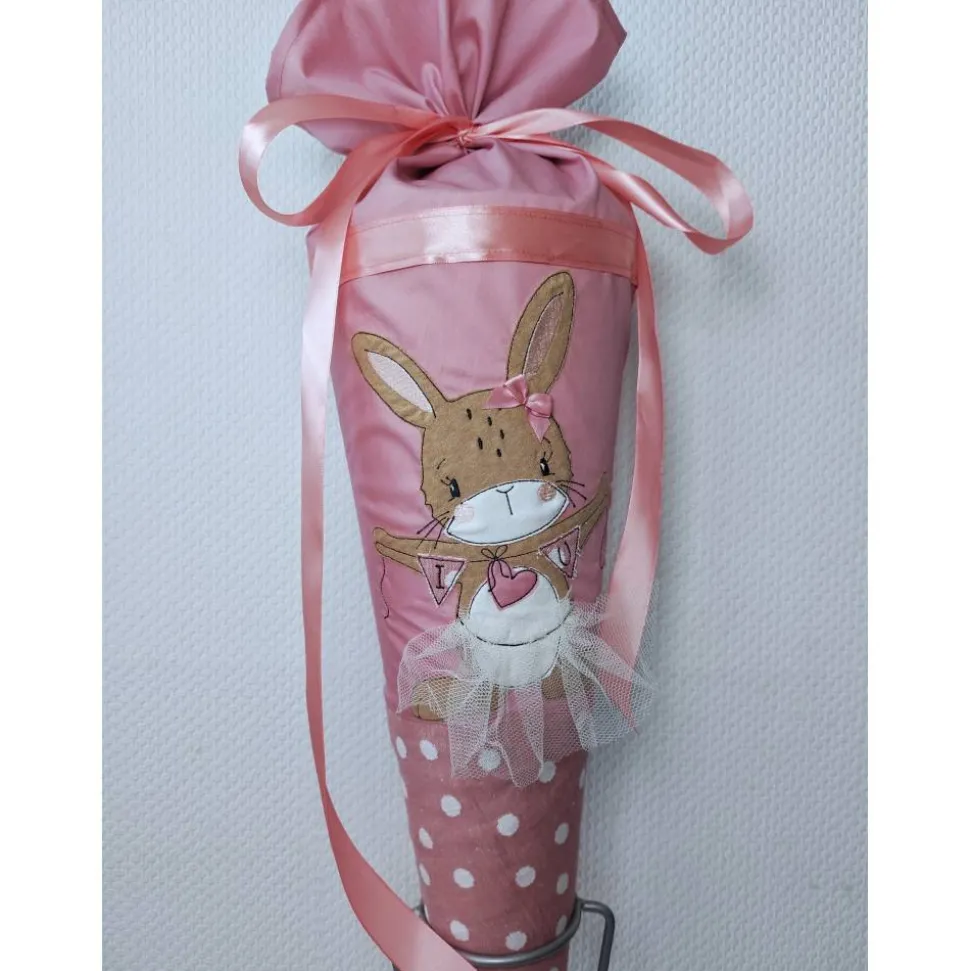Dies ist eine Schultüte für Mädchen mit einem gestickten Hasen mit Tüllrock.