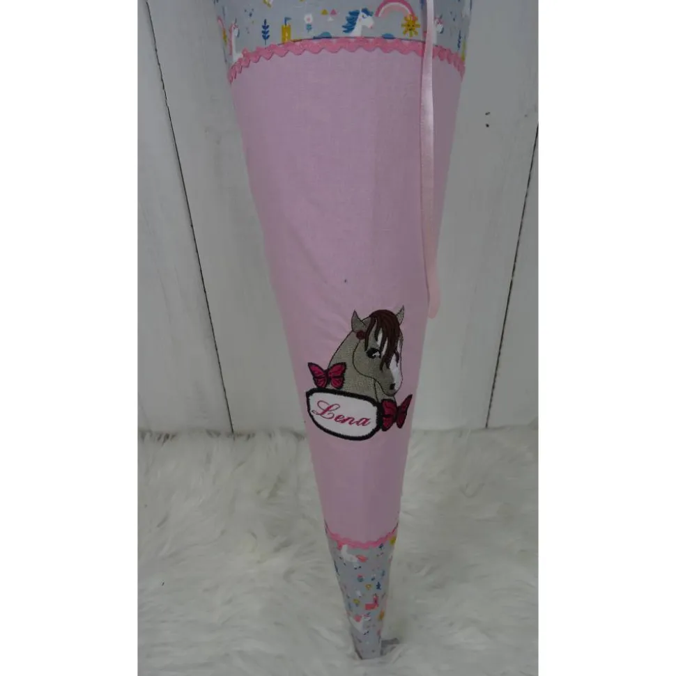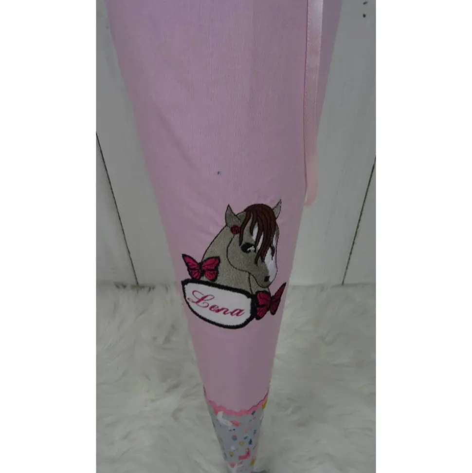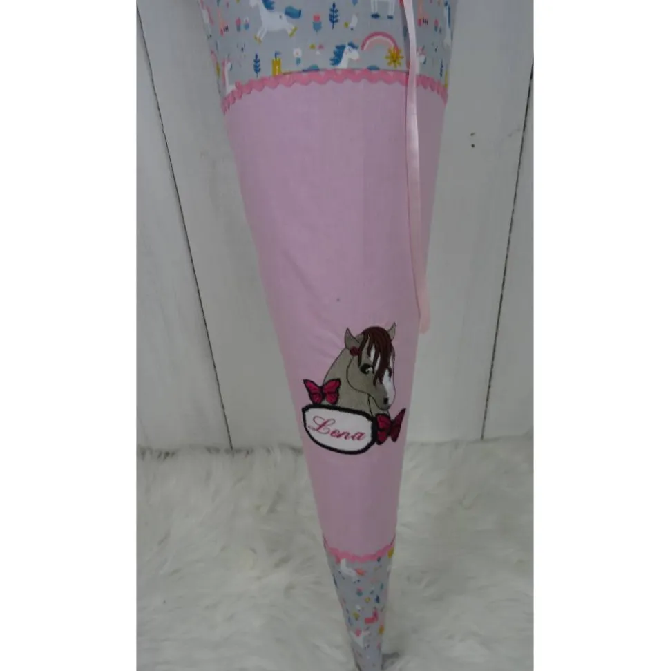 Die hier gezeigte Schultüte ist mit einem Pferd von Stickzebra bestickt. Zur Auswahl stehen noch jede Menge andere Motive. Auch hiervon übermittele ich gerne Fotos.