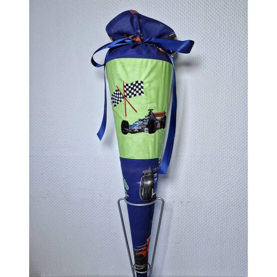 Dies ist eine Schultüte mit einem Rennauto. Der untere Teil der Tüte besteht aus einem Stoff mit Autorennen Motiven.