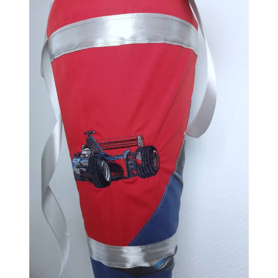 Ich kann gerne kurzfristig die Schultüte personalisieren. Der Vorname könnte in grau/silber schräg unter dem Rennauto oder darüber auf dem roten Stoff aufgestickt werden. Ein Beispiel in der Fotomontage.