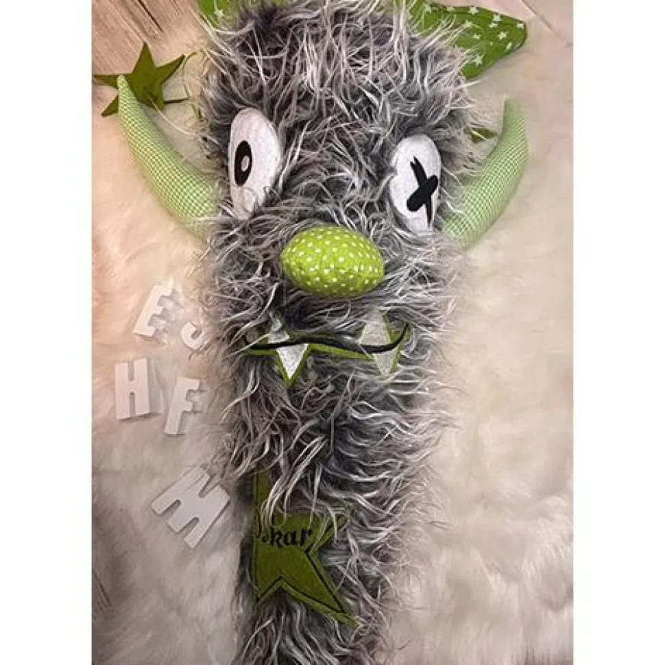 Das Gesicht ist gestickt auf Stoff und Filz und auf die Tüte aufgenäht, Hörnern und Nase sind ebenfalls aus grün-weißen Baumwollstoff, gefüllt mit Watte und fest an der Tüte vernäht. Hochwertig verarbeitet und mit viel Liebe genäht und gestickt. Die Stofftüte ist passend für die handelsüblichen Papprohlinge mit 70 cm Länge und 20cm Durchmesser in der Öffnung.