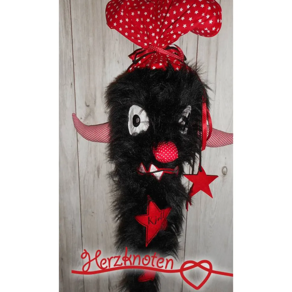 Das Gesicht ist gestickt auf Stoff und Filz und auf die Tüte aufgenäht, Hörnern und Nase sind ebenfalls aus rot-weißem Baumwollstoff, Hörner kariert, Nase gepunktet, gefüllt mit Watte und fest an der Tüte vernäht. Hochwertig verarbeitet und mit viel Liebe genäht und gestickt. Die Stofftüte ist passend für die handelsüblichen Papprohlinge mit 70 cm Länge und 20cm Durchmesser in der Öffnung.