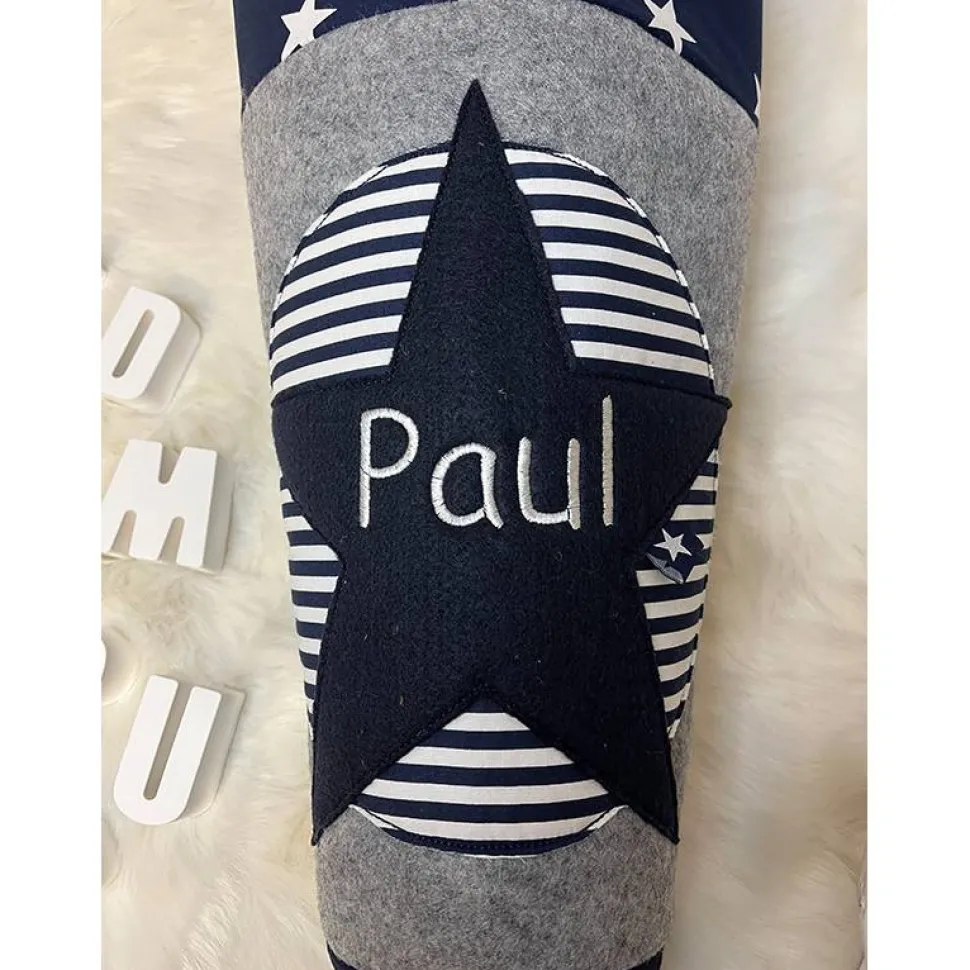 Auf dem mittleren Teil ist ein großer Kreis mit dunkelblau-weiß gestreiften Stoff, darauf ein dunkelblauer Filzstern mit Namen und ggfl Einschulungsdatum. Das Ganze ist in doodle Art gearbeitet, dh mit gewollt fransigen Stoffkanten. Hochwertig verarbeitet und mit viel Liebe genäht und gestickt. Die Stofftüte ist passend für die handelsüblichen Papprohlinge mit 70 cm Länge und 20cm Durchmesser in der Öffnung.