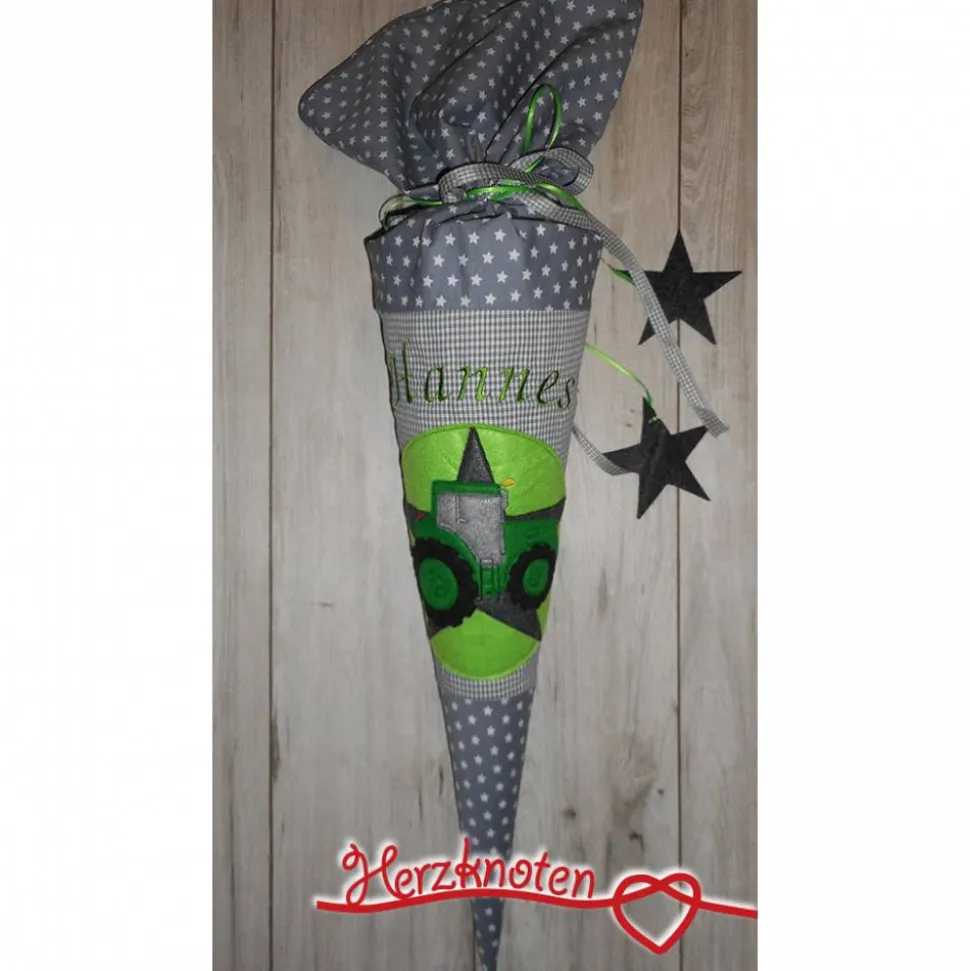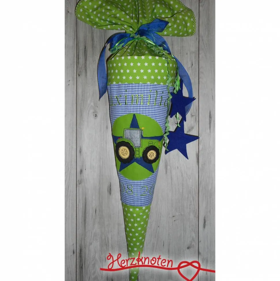Komplett in grün und blau aus zwei verschiedenen von schönen Baumwollstoffen, grün -weiß mit Sternen und blau-weiß kariert. Darauf ist ein großer grüner Kreis mit einem Stern aus blauem Filz appliziert. Darauf wurde der Traktor in grün gestickt und appliziert. Der Name in grün steht mittig darüber. die Tüte wird mit zwei verschiedenen Bändern verschlossen, daran hängen noch mal zwei Sterne. Die Tüte kann in jeder gewünschten Farbkombination gestaltet werden!
