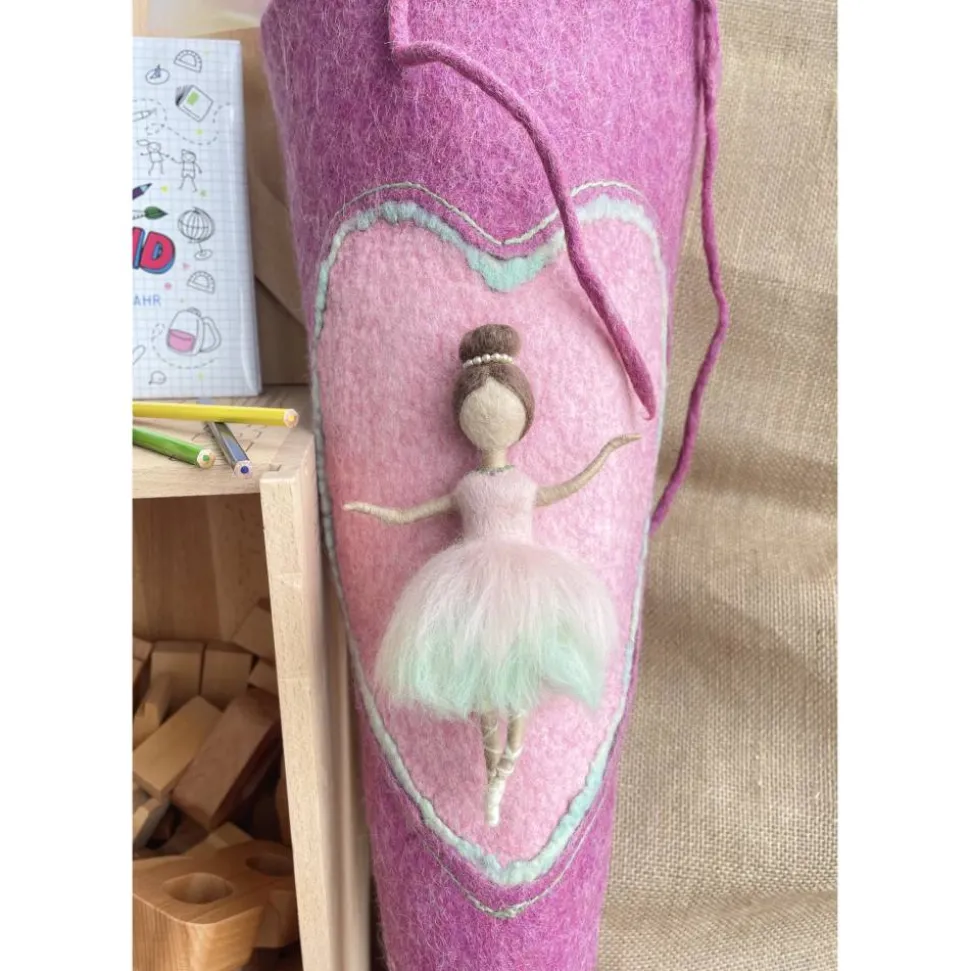 Die Schultüte wurde nassgefilzt, die Öffnung wurde mit dem hochwertigen Tüll und Baumwollestoff sorgfältig und sauber per Hand an die Tüte angenäht.