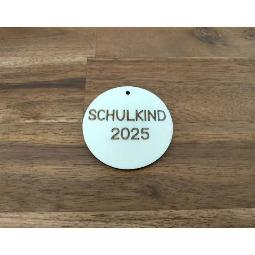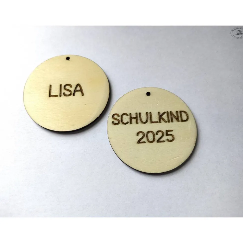 Beidseitig gravierter Schultüten-oder Schulranzen-Anhänger aus Pappelsperrholz mit der Aufschrift„Schulkind + Jahreszahl“ auf der einen und dem eigenen Namen aufder anderen Seite – ebenfalls als perfektes Erinnerungsstück oderDekoration.