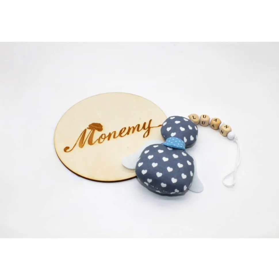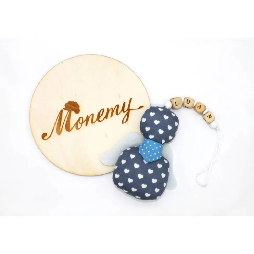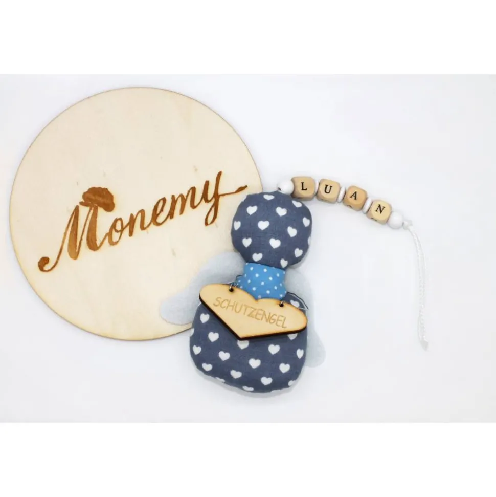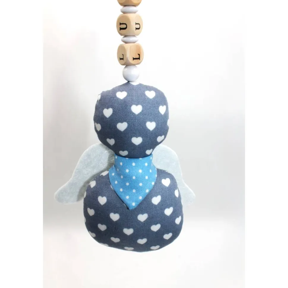 Der Knoten an der Schnur lässt sich leicht lösen um die Holzbuchstaben und Perlen zu entfernen. Die Flügel können auch entfernt werden, Somit lässt sich der kleine Engel prima per Handwäsche waschen.