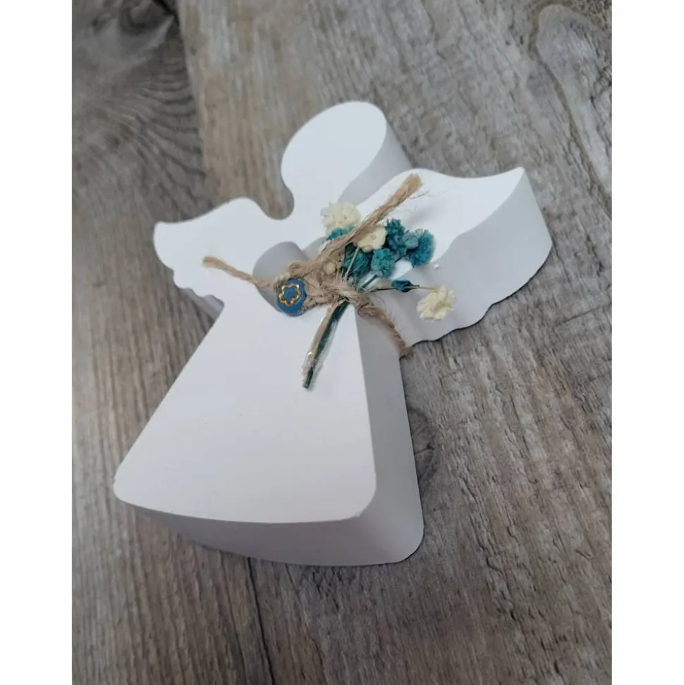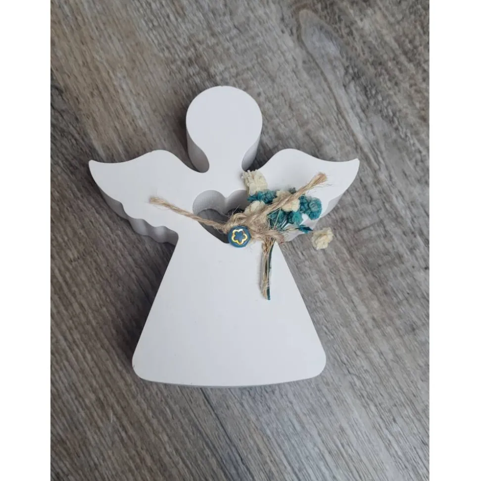Dieser Schutzengel mit Blumendeko in Blautönen ist aus Keracraft hergestellt und hat folgende Maße 7,5 x 7 x 2 cm.