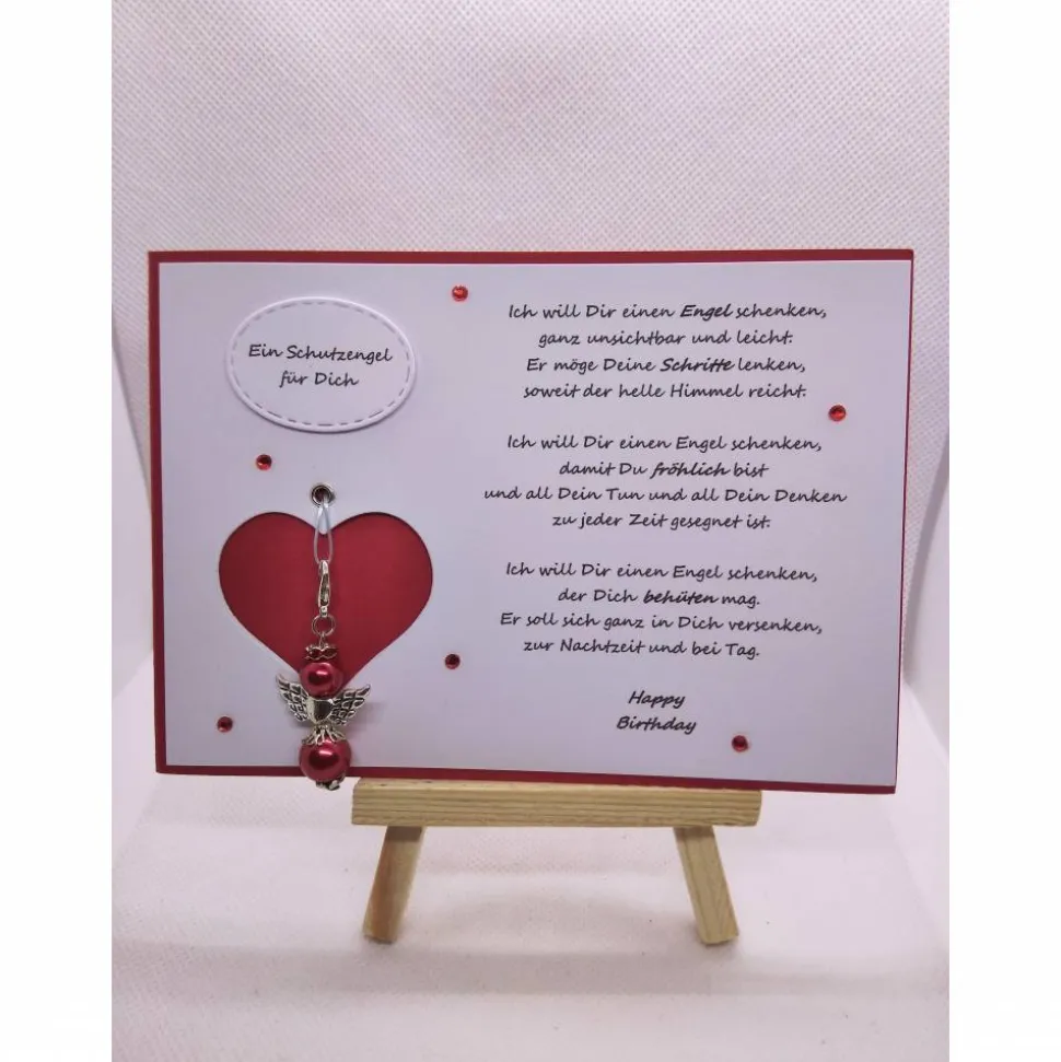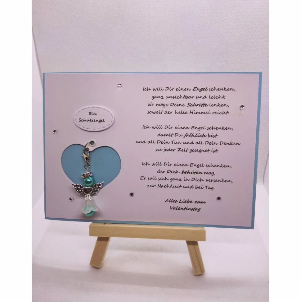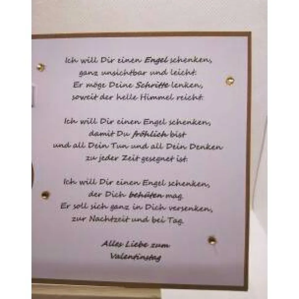 Die Karte wurde aus hochwertigem 210 g schweren Farbkarton von mir hergestellt. Der Aufleger mit dem Spruch wurde bedruckt, und mit der Ausstanzung versehen. An der Öse wurde der Engel mittels des Karabiner eingehängt.