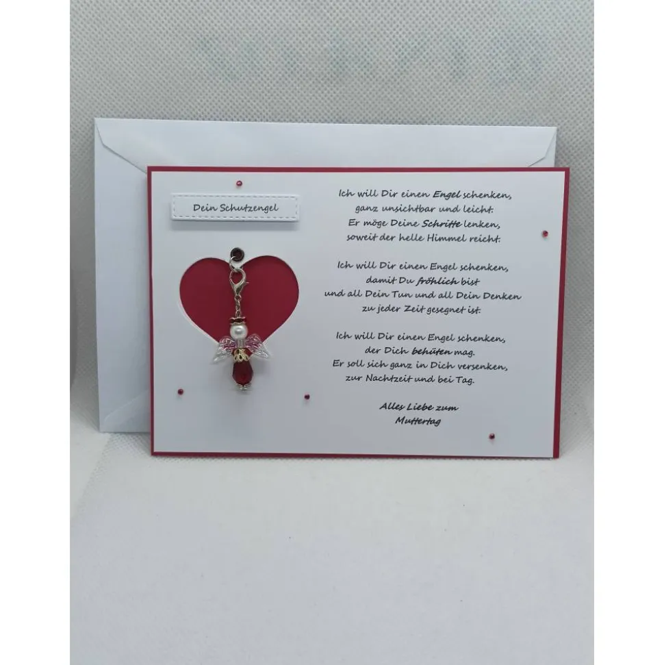 Die Karte wurde aus hochwertigem 210 g schweren Farbkarton von mir hergestellt. Der Aufleger mit dem Spruch wurde bedruckt, und mit der Ausstanzung versehen. An der Öse wurde der Engel mittels des Karabiner eingehängt.