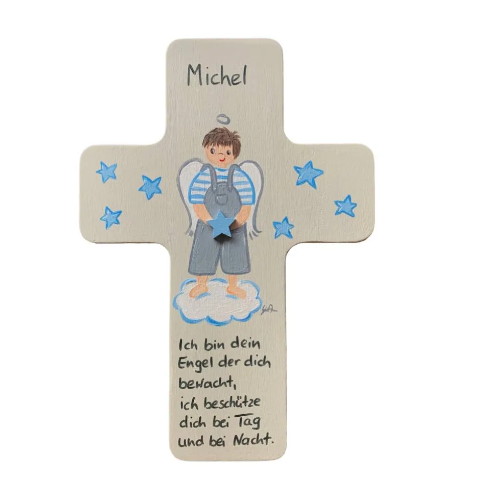 Jedes Kreuz wird nach deinen individuellen Wünschen bemalt und beschriftet. Du kannst Name, Farbe, Haarfarbe des Engels, Geburtsdaten, Tauf- oder Schutzengelvers und das jeweilige Datum anpassen. So erhältst du ein echtes Unikat, das speziell für dich gestaltet wird.