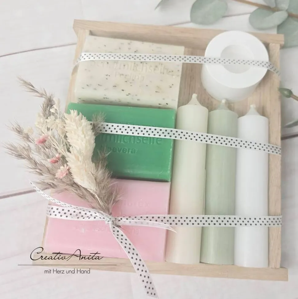 Zusätzlich sind noch drei Kerzen und ein handgegossener Kerzenhalter aus Beton in dem Holztablett enthalten.
