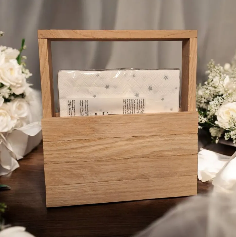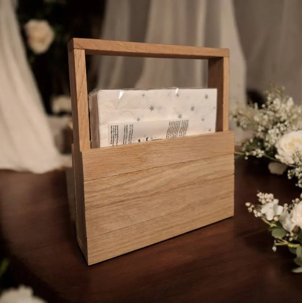 Dieser handgefertigte Serviettenhalter aus massivem, unbehandeltem Eichenholz verbindet natürliche Ästhetik mit funktionalem Design. Der Serviettenhalter ist passend für kleine Servietten mit 12,5 × 12,5 cm und überzeugt durch ein schlichtes, zeitloses Design sowie eine stabile, langlebige Ausführung.