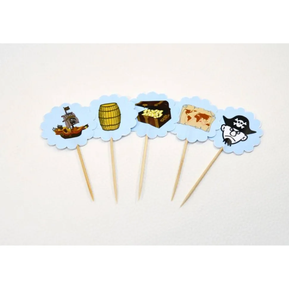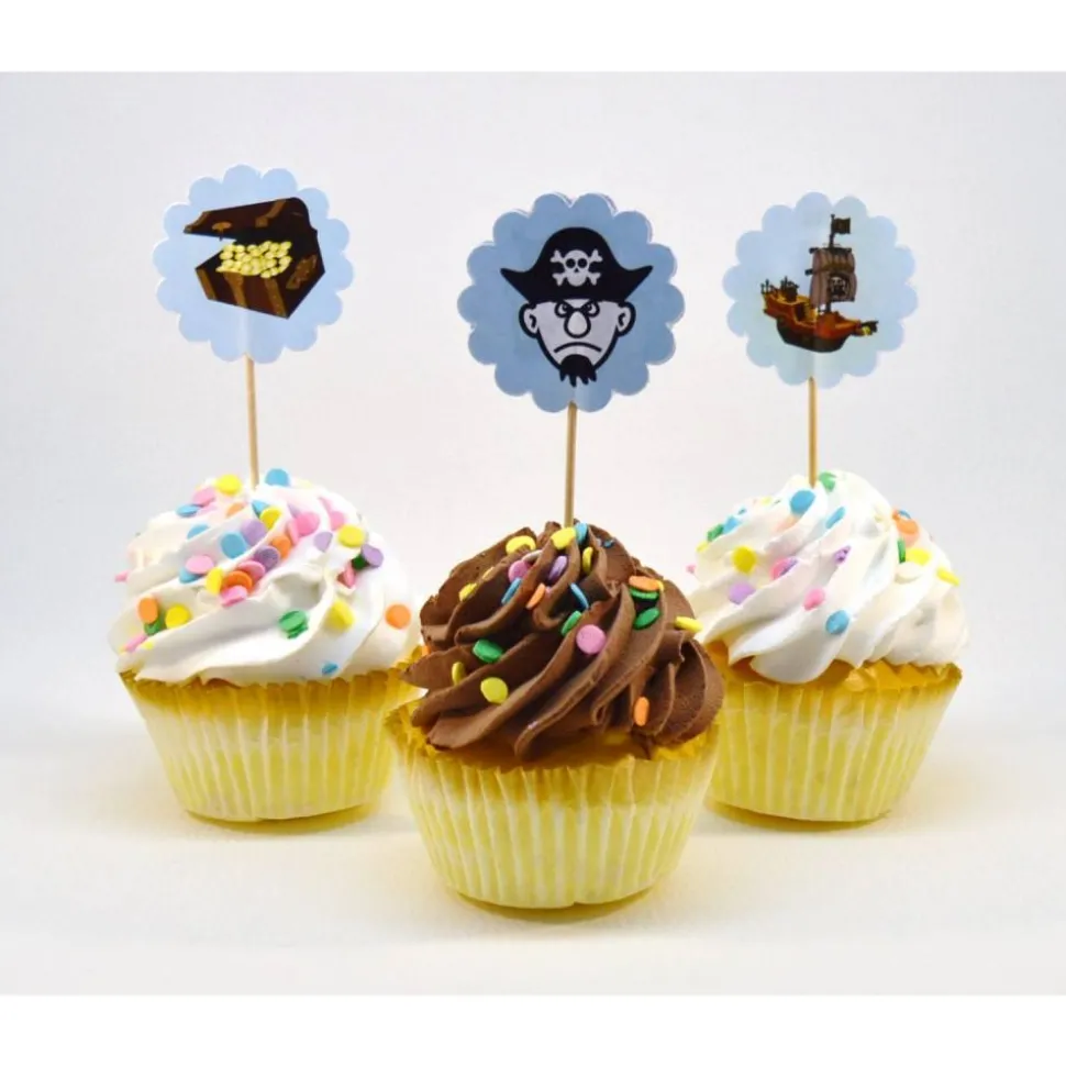 Unser besonderes Cupcake-Topper-Set besteht aus 6 Flags mit fünf unterschiedlichen Piraten-Motiven: