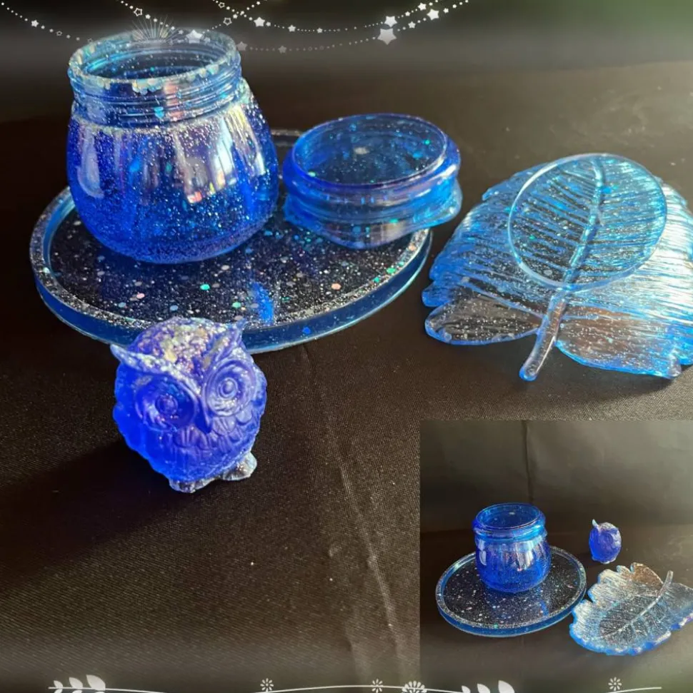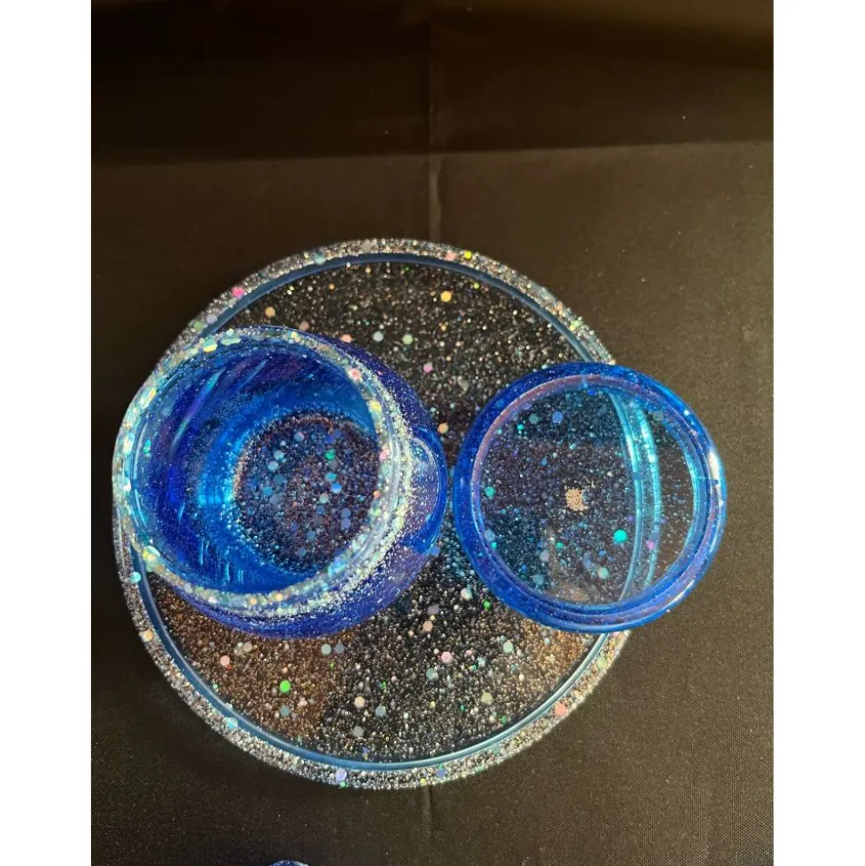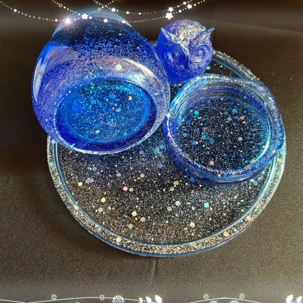 Das Resin habe ich in Blau und mit Glitzer eingefärbt. Das Material ist stabil und langlebig, was eine langfristige Nutzung ermöglicht. Holen Sie sich mit diesem Set eine stilvolle und gemütliche Atmosphäre in Ihr Zuhause.