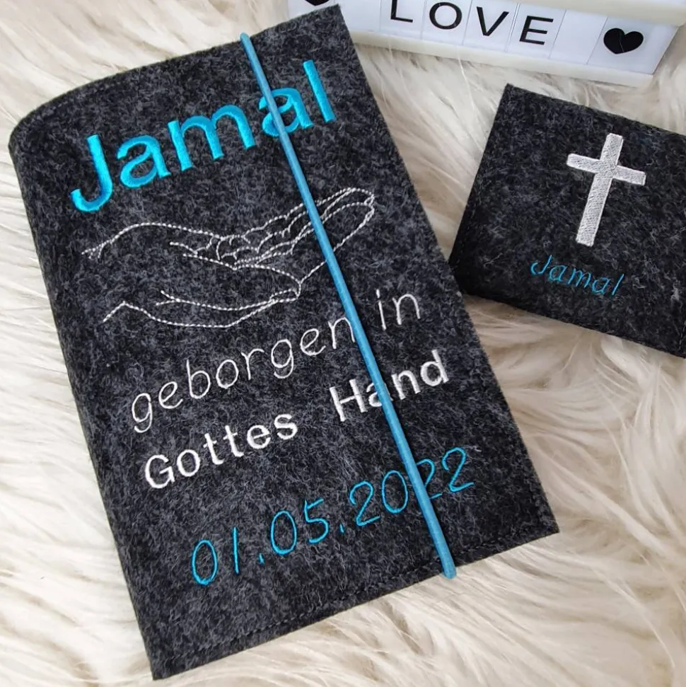Hochwertige Gotteslobhülle aus Polyesterfilz (3,0 mm), bestickt mit eine Hand Gottes und dem Spruch „geborgen in Gottes Hand (gerne auch mit dem Namen und Datum) mit passendem Rosenkranztäschchen.