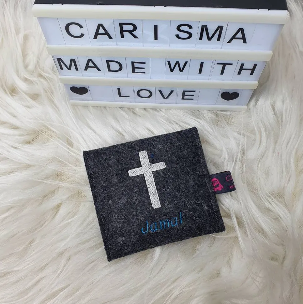 Gerne personalisiere ich die Hülle mit Namen des Kindes und Datum der Kommunion . Das Rosenkranztäschchen bekommt ein passendes Kreuz und den Namen des Kindes (ein Datum passt hier leider nicht mit drauf).