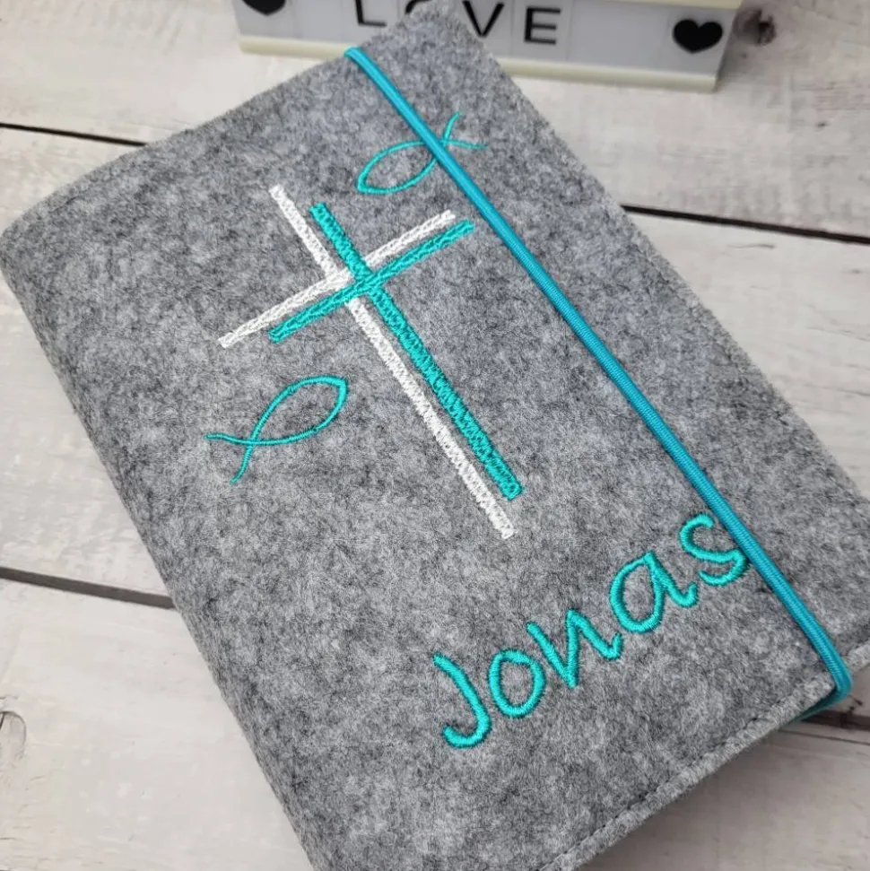 Farbwahl des Filzes, Name des Kindes und Datum der Kommunion falls dies mit auf die Hülle gestickt werden soll.