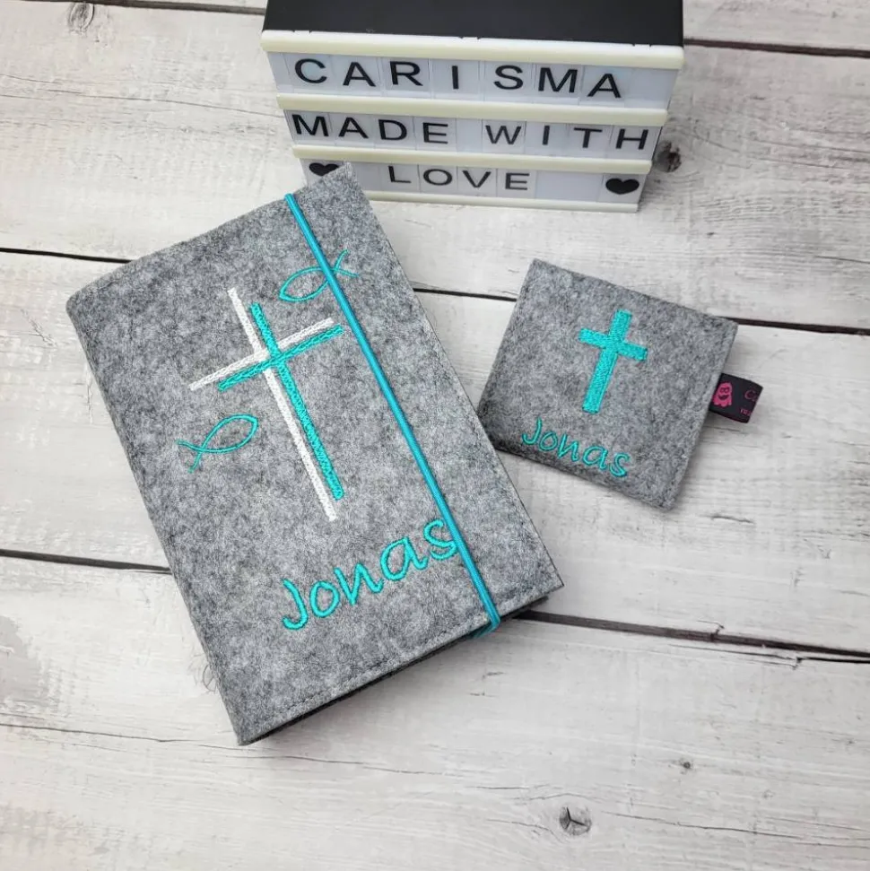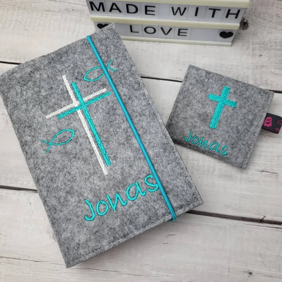 Hochwertige Gotteslobhülle aus Polyesterfilz (3,0 mm), bestickt mit einem Doppel Kreuz und Fischen (gerne auch mit dem Namen und Datum) mit passendem Rosenkranztäschchen.