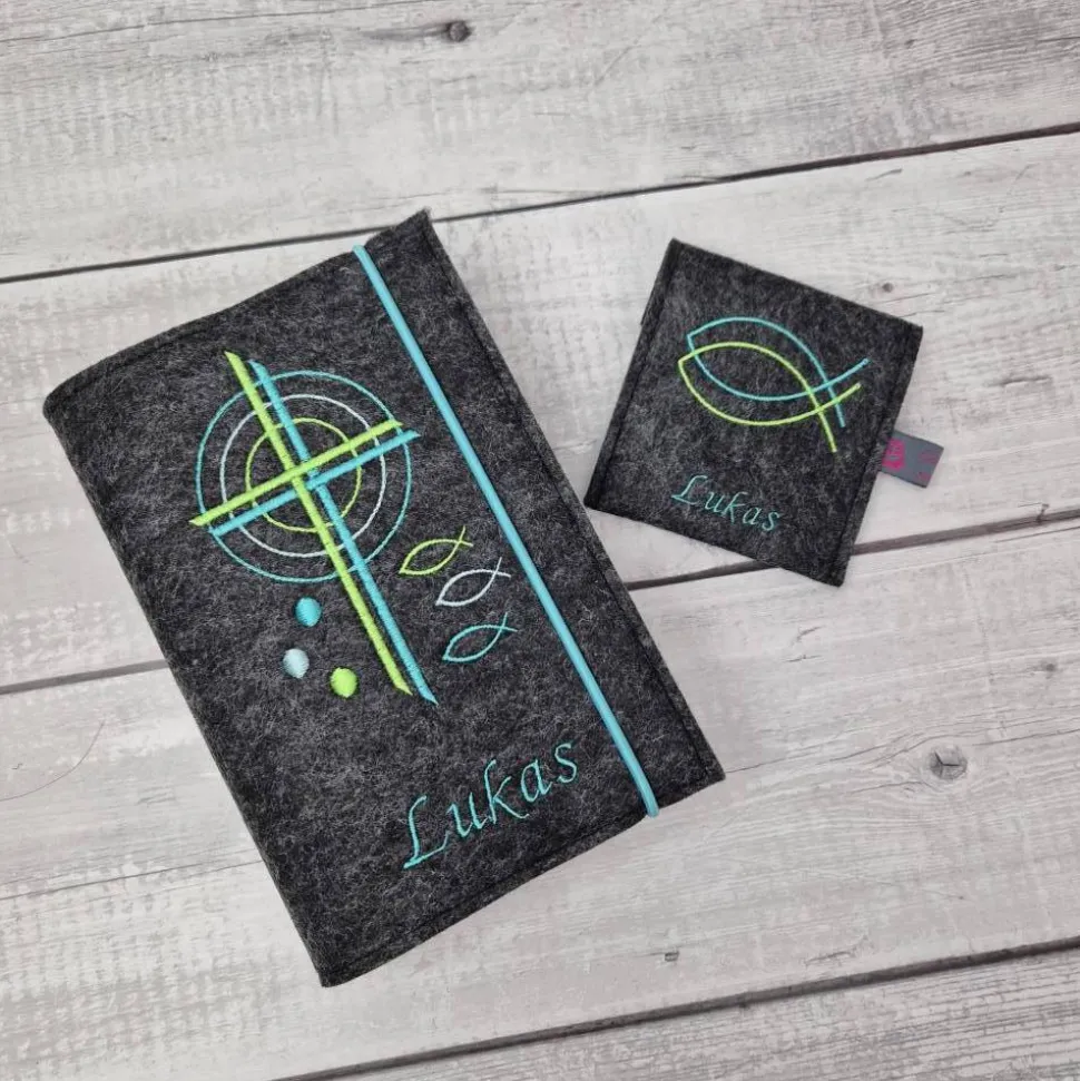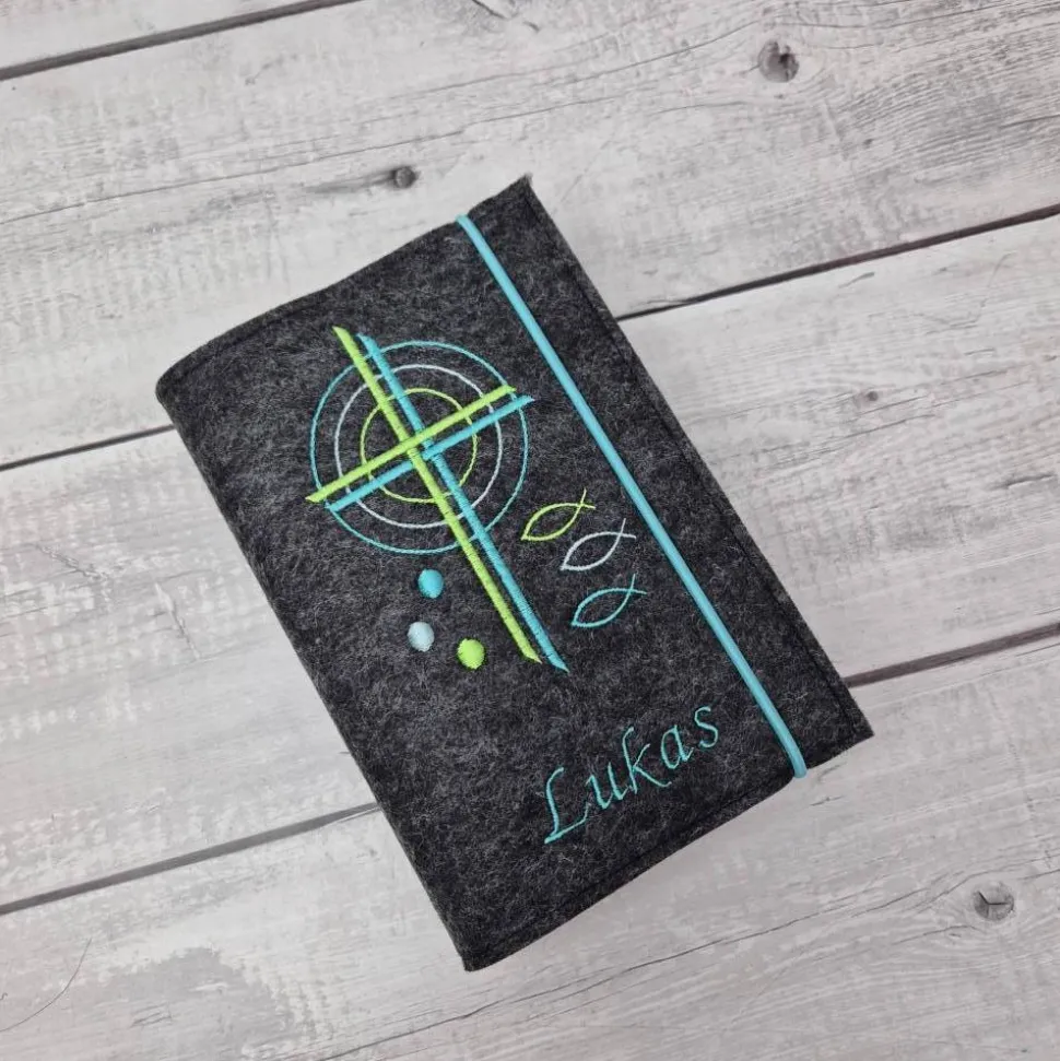 Farbwahl des Filzes, Name des Kindes und Datum der Kommunion falls dies mit auf die Hülle gestickt werden soll.
