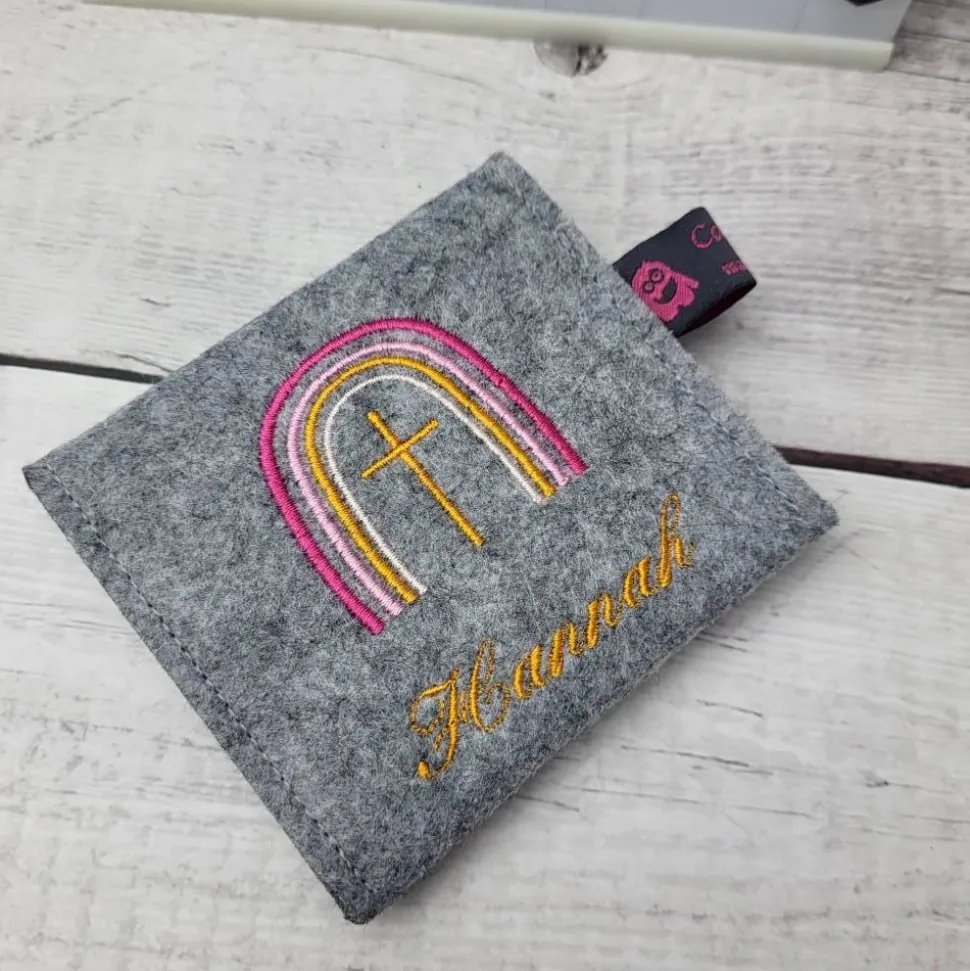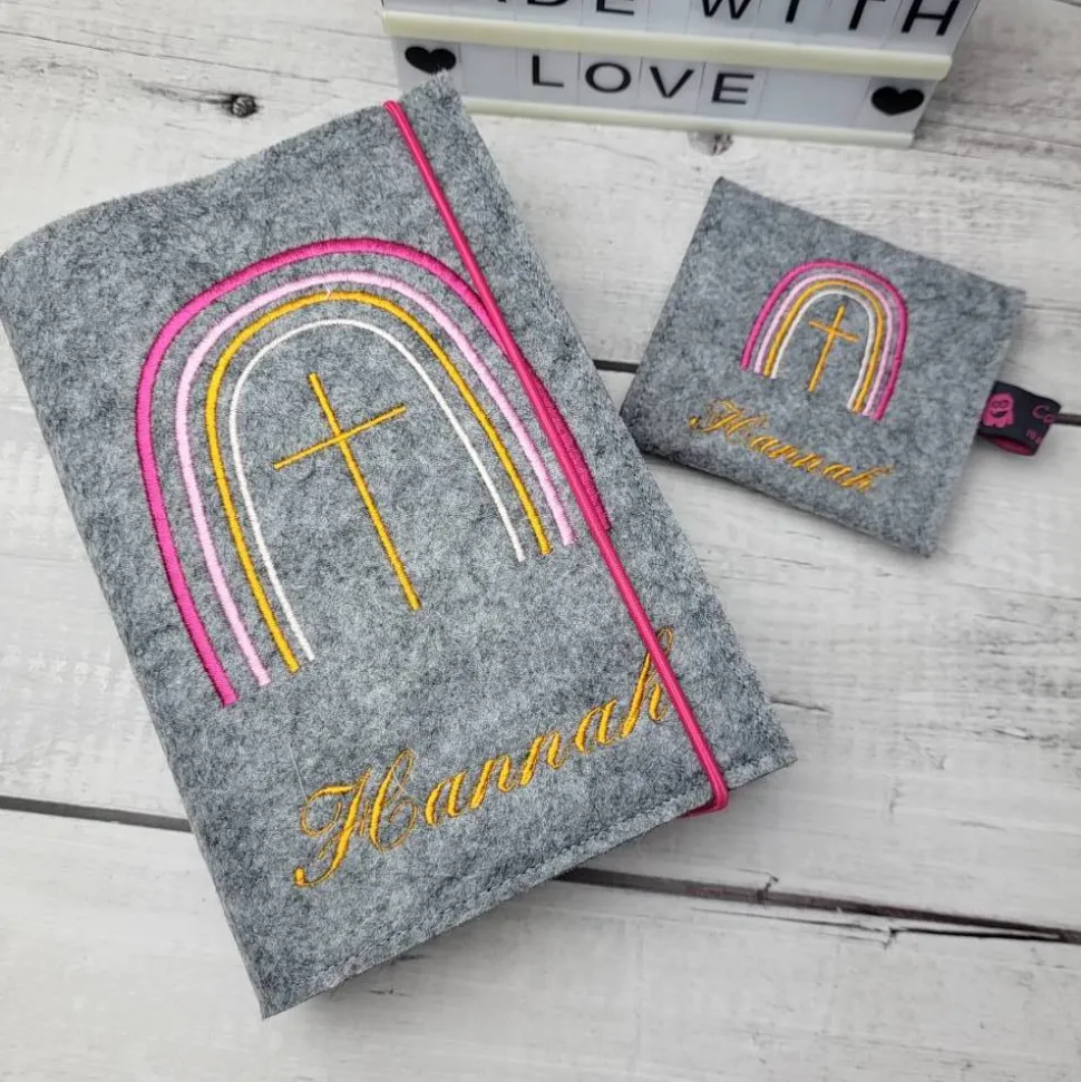 Hochwertige Gotteslobhülle aus Polyesterfilz (3,0 mm), bestickt mit einem Kreuz und Regenbogen (gerne auch mit dem Namen und Datum) mit passendem Rosenkranztäschchen.