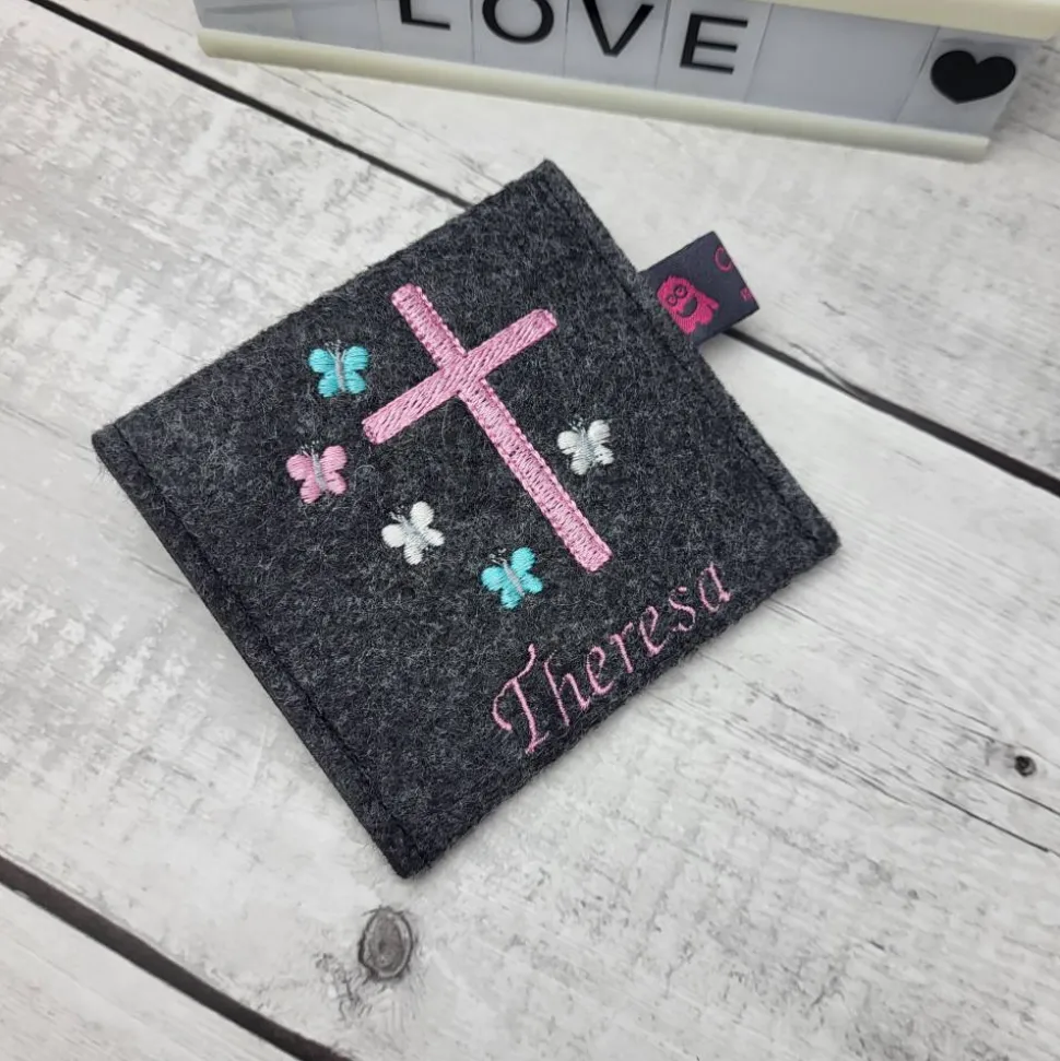 Hochwertige Gotteslobhülle aus Polyesterfilz (3,0 mm), bestickt mit einem Kreuz und Schmetterlingen (gerne auch mit dem Namen und Datum) mit passendem Rosenkranztäschchen.